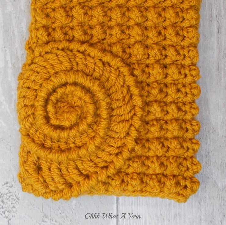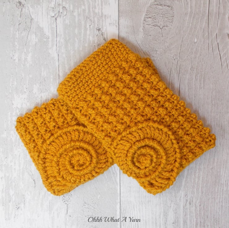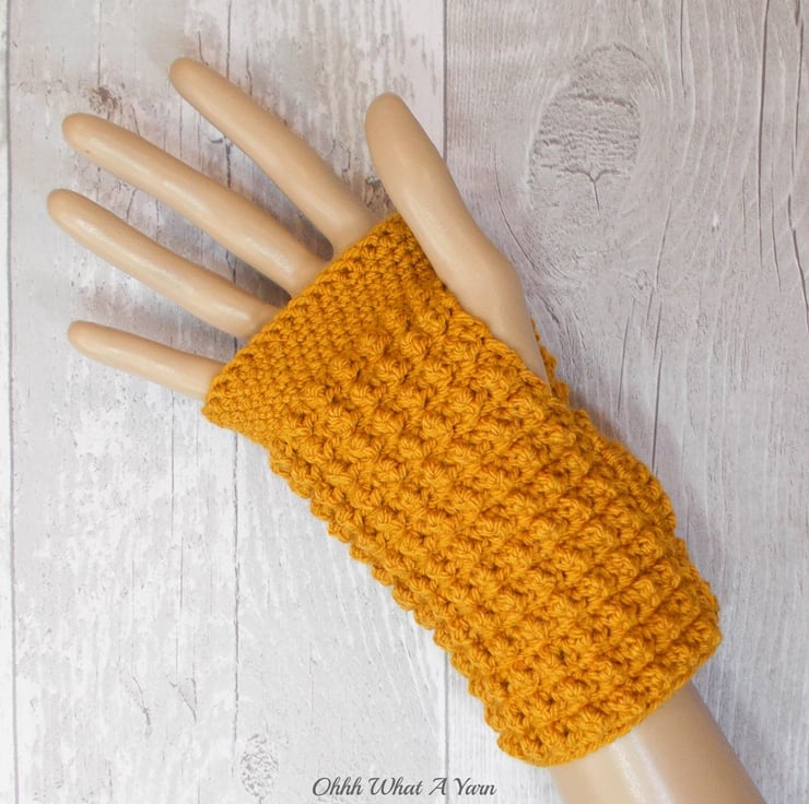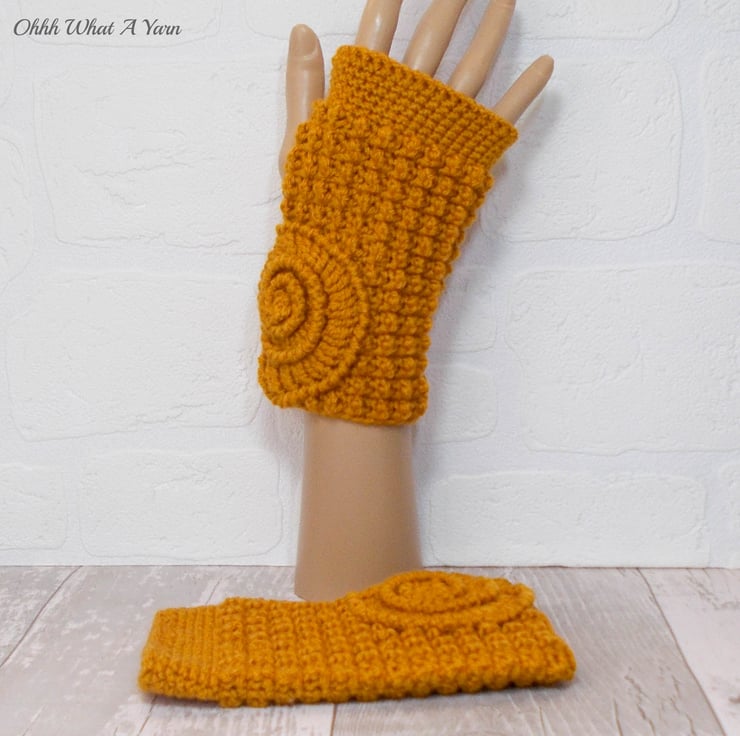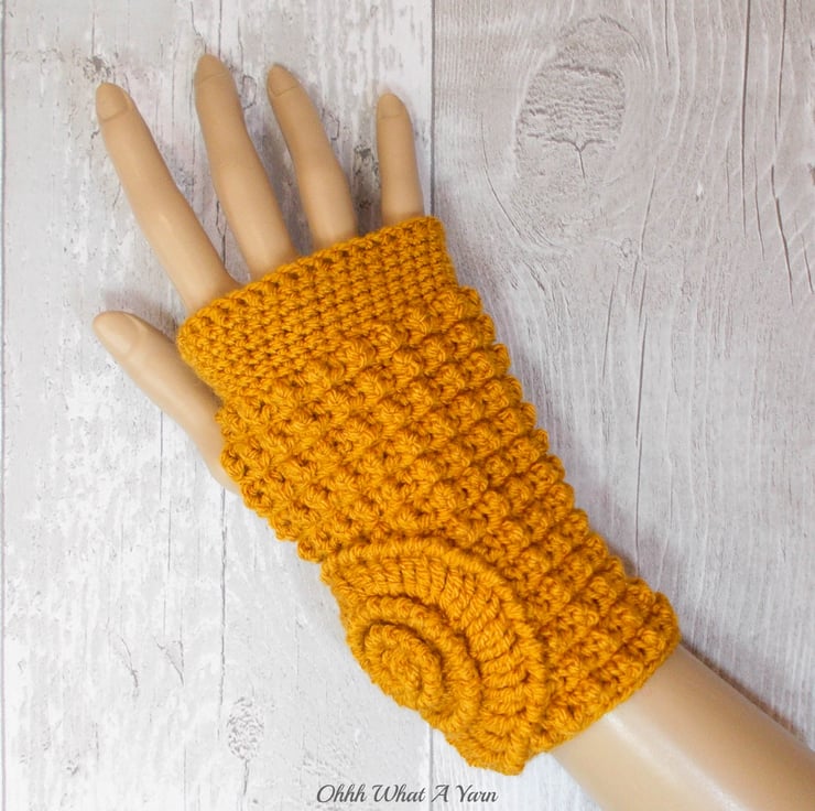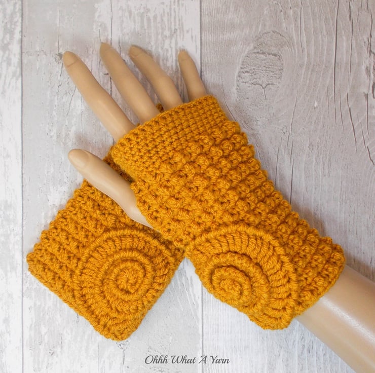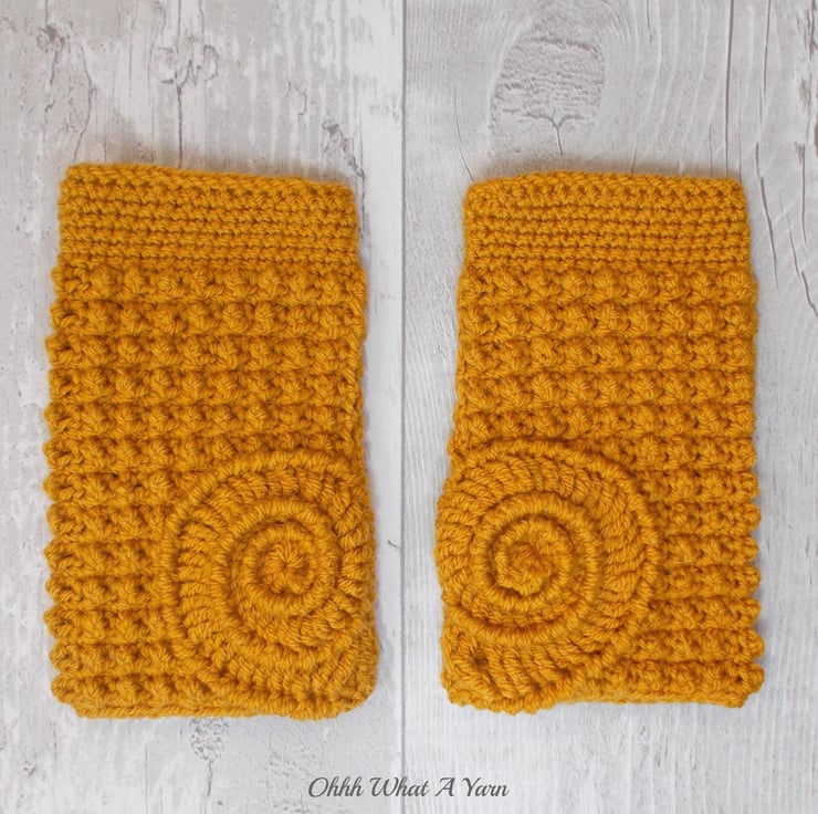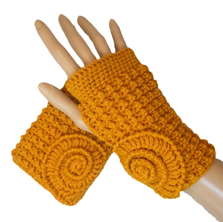 These gorgeous ammonite fingerless gloves have been crocheted using 100% acrylic yarns in a beautiful dark gold colour.