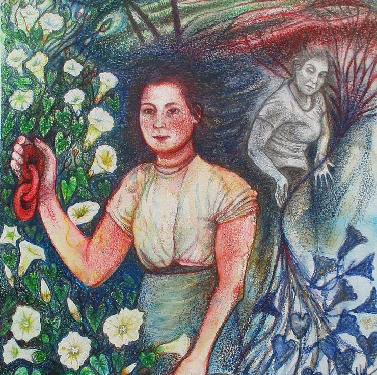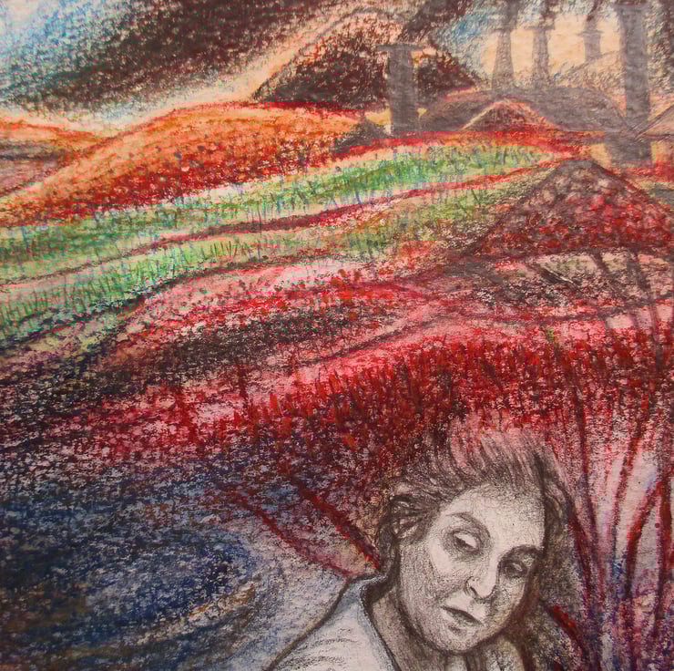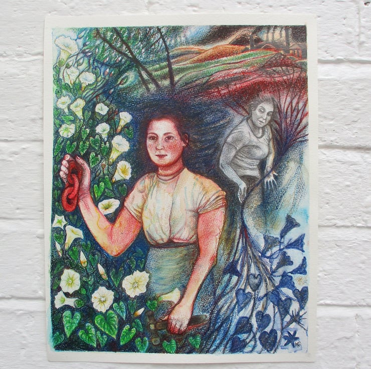 This is an original mixed media drawing. It is my exploration of the section of the River Tame as it runs through the Black Country. I have used historical images and my own photographs as sources for this imaginary scene. The girl in the foreground represents the spirit of the River Tame as it runs through the old industrial Black Country, the spirit of nature is all around her, showing that nature survives despite the pollution caused by so many years of industry in the area, the grey figure behind her is the industrial spirit (toil and pollution), and the river flows through the old factories in the distance towards a purer place, represented by the bindweed in the foreground.