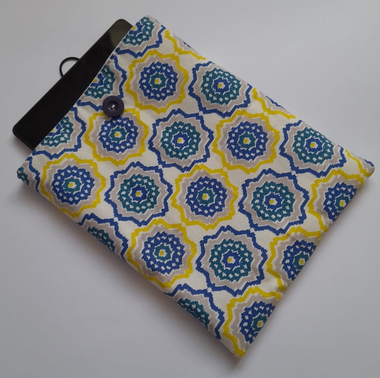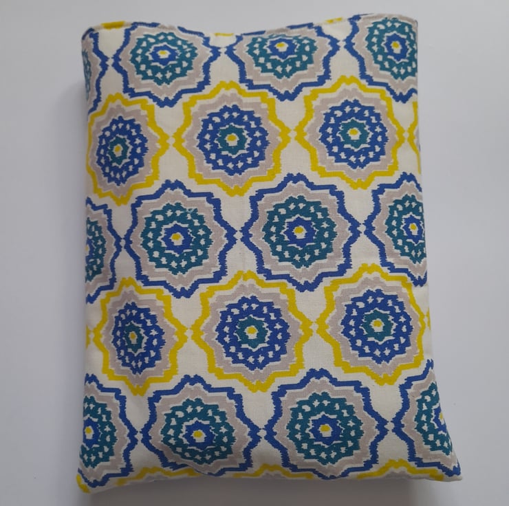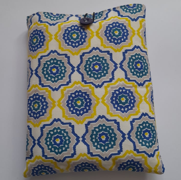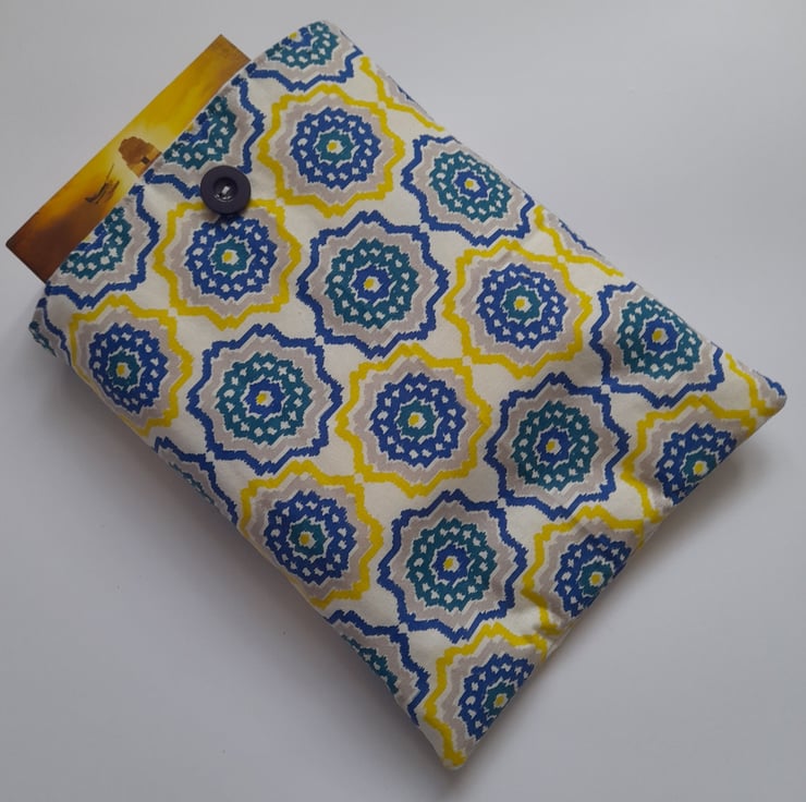 The sleeve is made out of a blue and yellow patterned cotton fabric on the outside and a white cotton fabric on the inside. The sleeve is padded for extra protection for your book and a button with elastic is used to close your sleeve