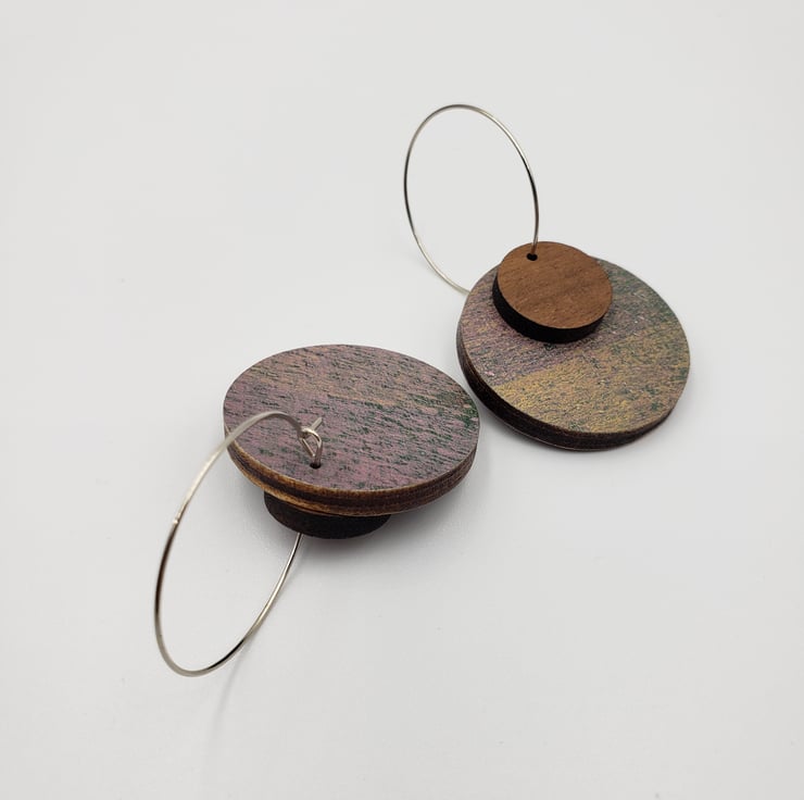 Small handmade printed wooden dangly earrings, in muted tones of lavender, brown, green and camel colour. I have finished them off with a tiny circular wooden walnut disc, adding dimension and interest to these everyday wearable earrings. (These can easily be removed if you prefer without).