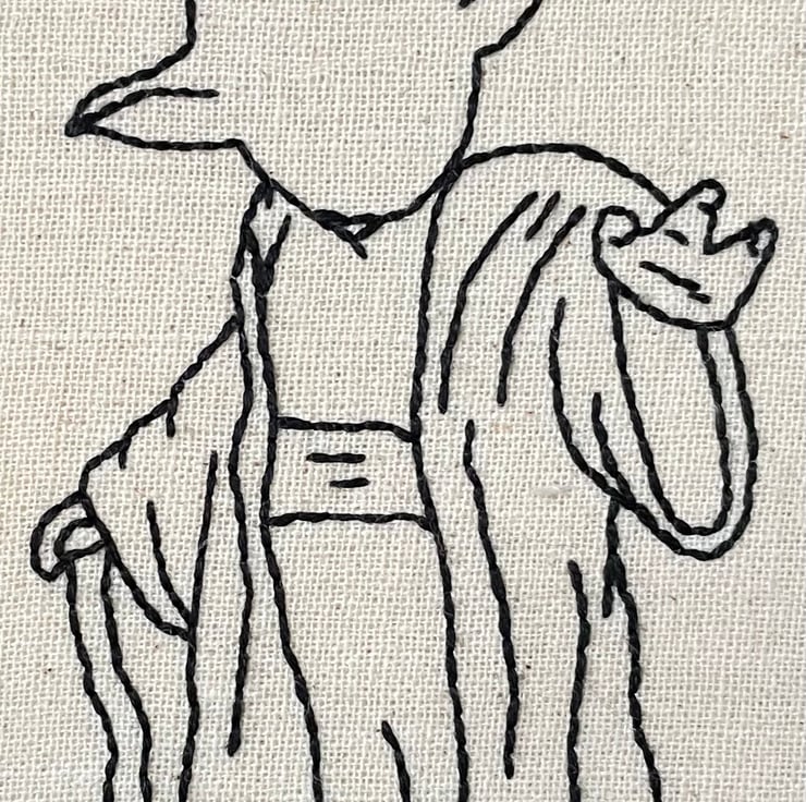 Stitched onto cotton fabric and using DMC threads, set into a wooden hoop.