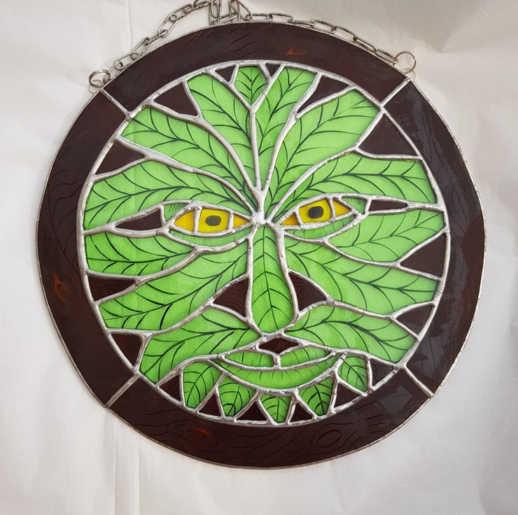My green man is handmade using the copper foil technique and has green and brown translucent glass. It has also been hand painted,