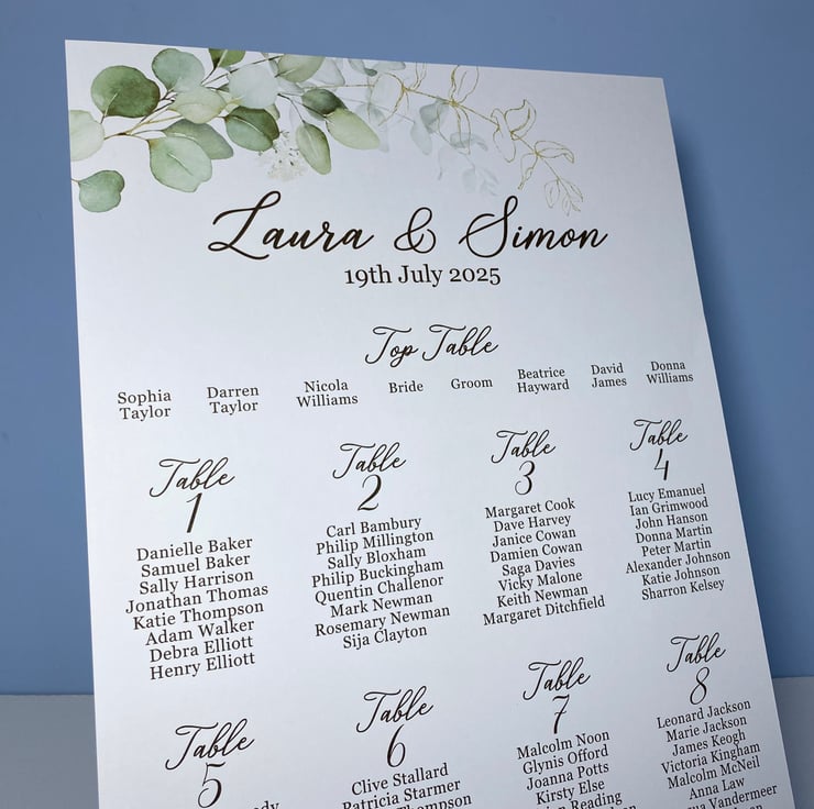 Personalised WEDDING table seating plan A3, A2 and A1 size, simple eucalyptus leaves greenery, golden leaves, rustic wedding theme design.