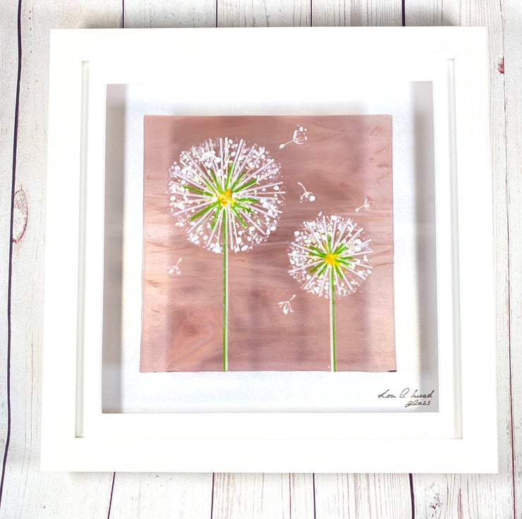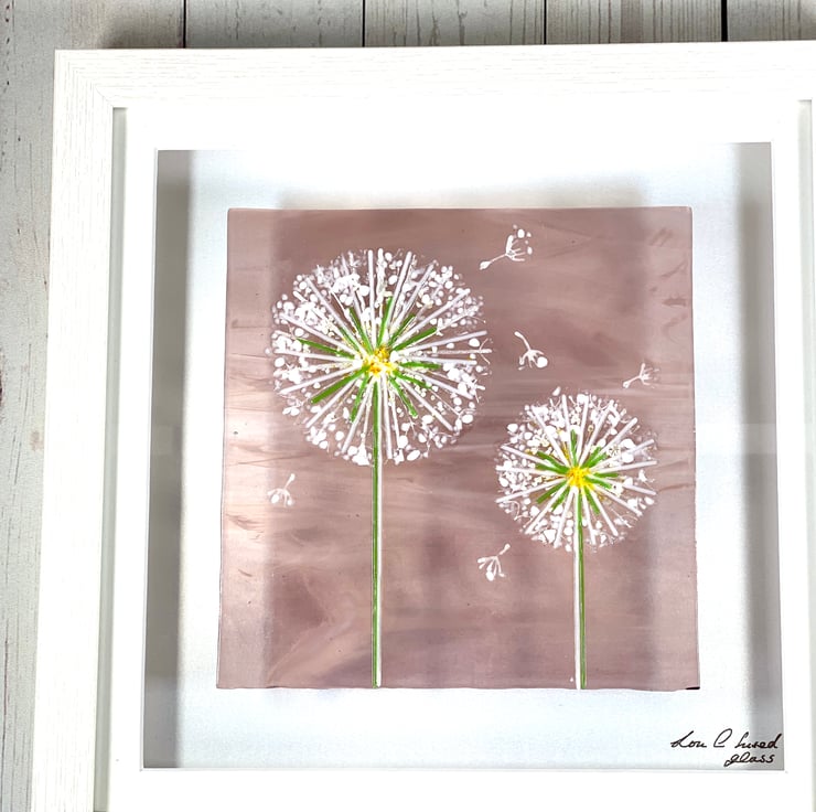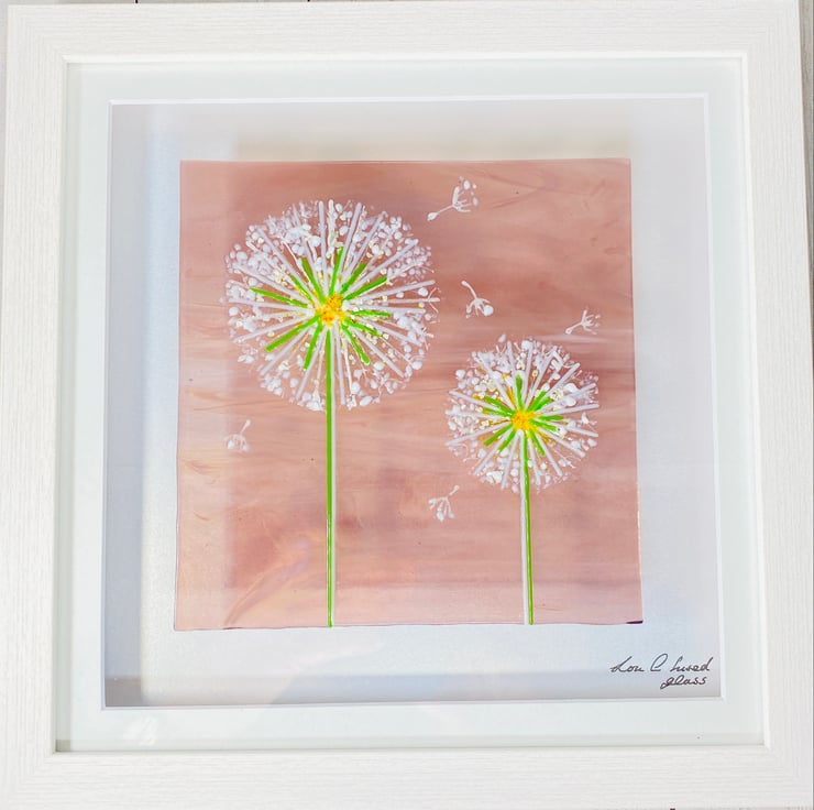 Delicate thin strips of glass are used to create these lovely dandelions onto a piece of pale purple whispy glass . There are also some delicate silver flakes scattered amongst it . Such a pretty 28cm square fused glass art picture which is ready to hang anywhere in the home .