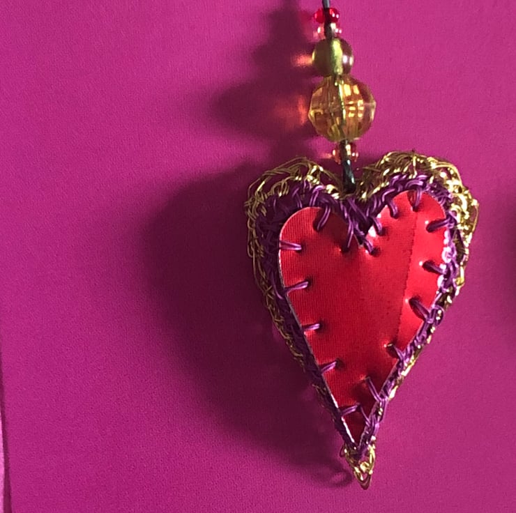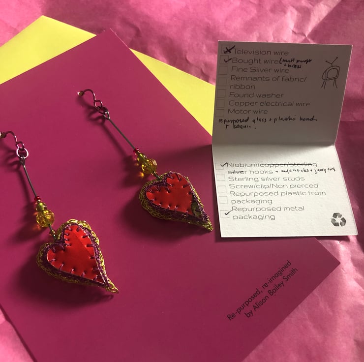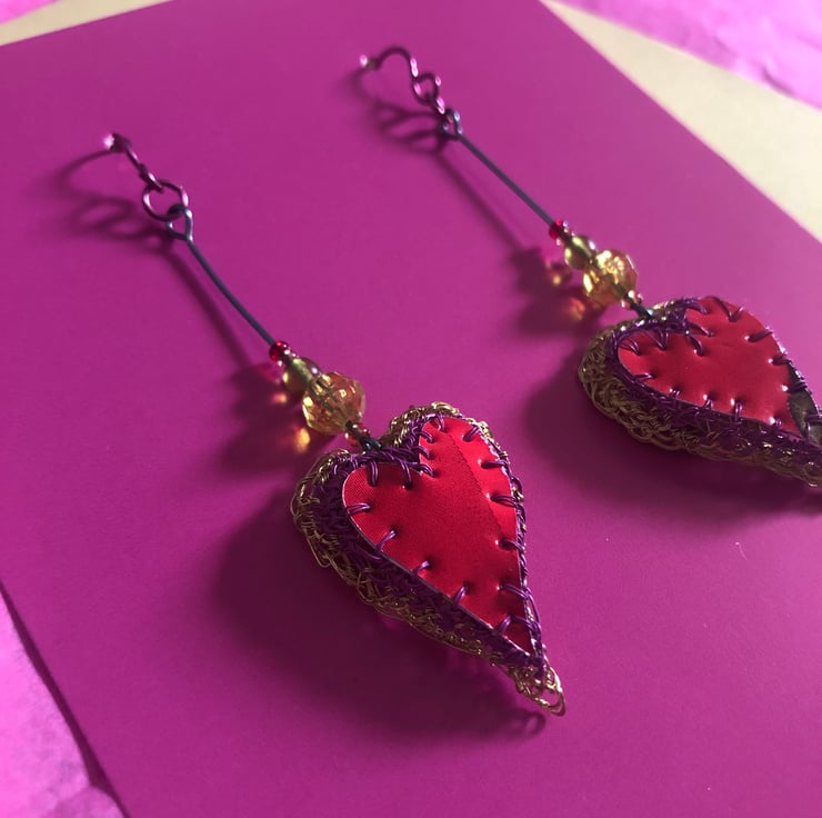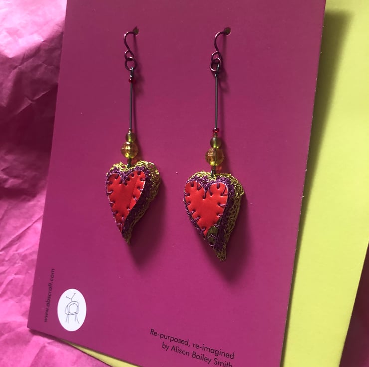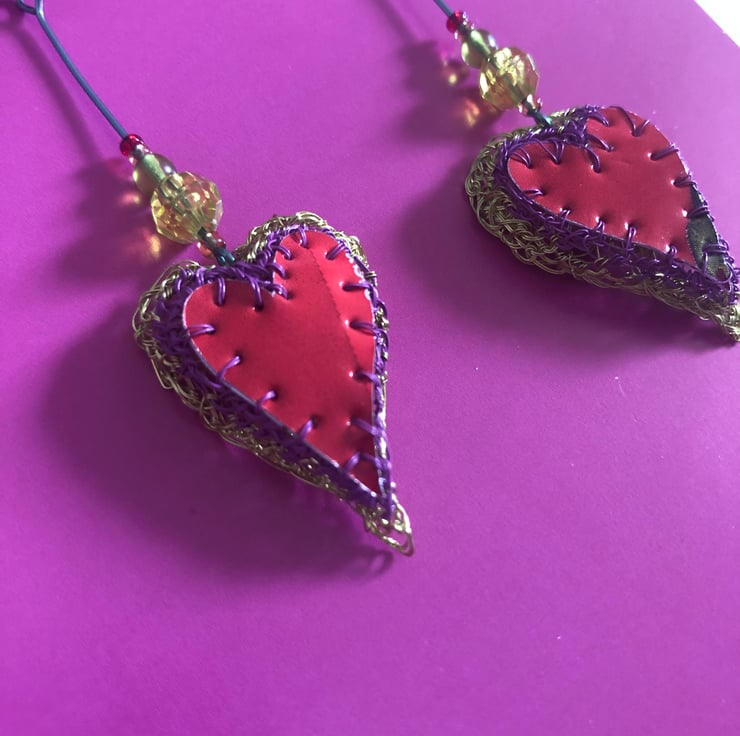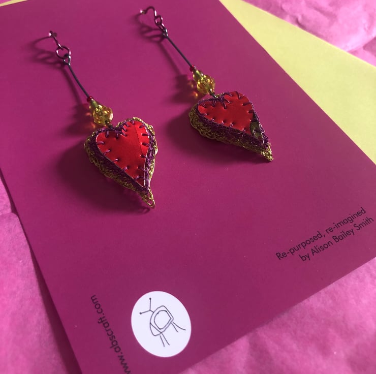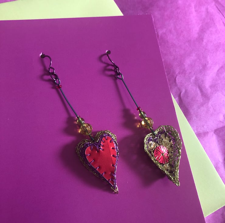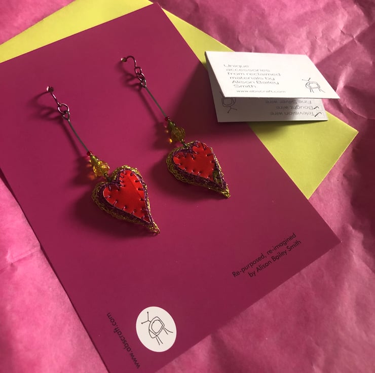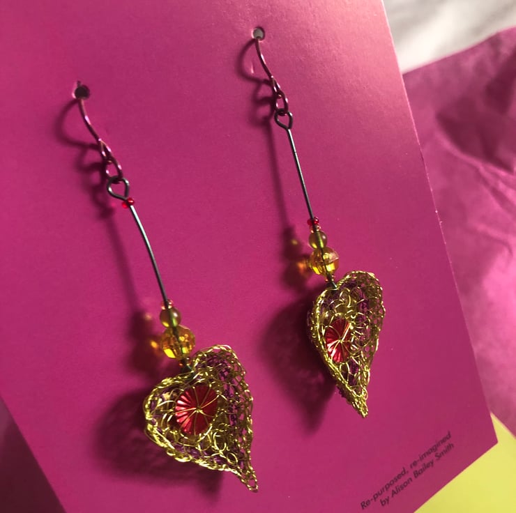 SOLD: Dangly heart earrings with repurposed vintage glass and plastic beads, niobium eye pins, jump rings and hooks, stitched lacquered copper wire, metal repurposed from tomato puree tube with red sequins on reverse.