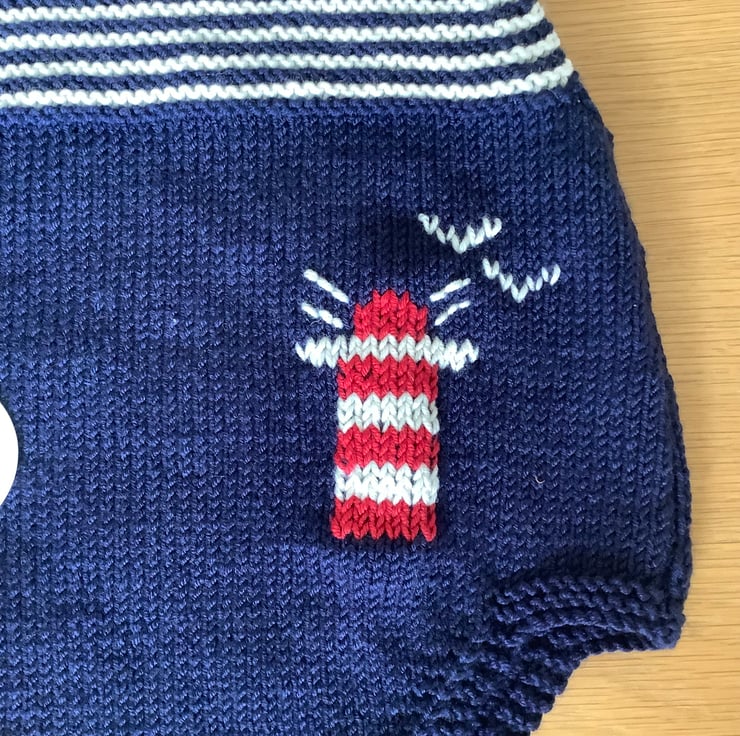 It is navy blue in colour and has cream stripes on the top. It has a cranberry red and cream lighthouse embroidered on the front.