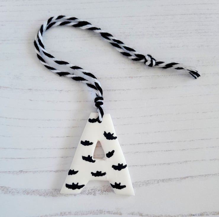 A unique decoration, made from black or white polymer clay, cut into a letter shape of your choice, then decorated by hand using acrylic paint with either black bats or orange pumpkins. Sealed to finish. Such a unique personalised decoration for Halloween!