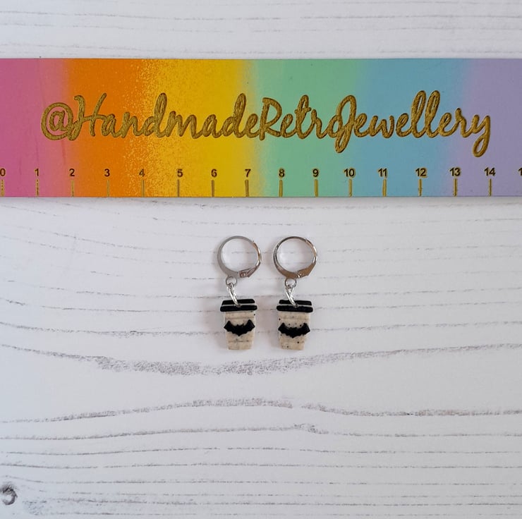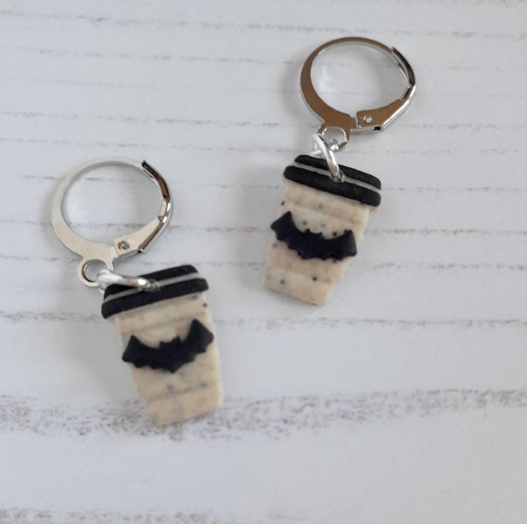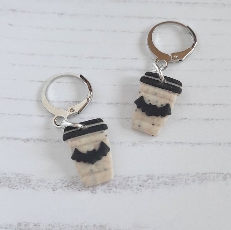 These mini coffee cup earrings have been carefully hand crafted using stone polymer clay, cut in the shape of teeny tiny travel cups. They feature a teeny tiny bat cut from black polymer clay, adding a spooky effect for Halloween! Black lids are painted using acrylic paint.