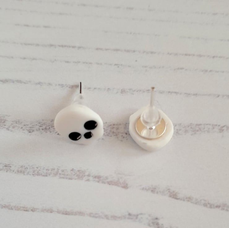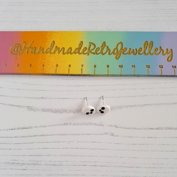 These mini earrings have been carefully hand crafted using white polymer clay, in the shape of skulls! Black detail is hand painted using acrylic paint to finish.