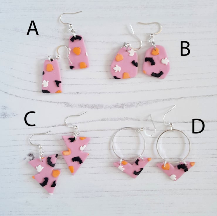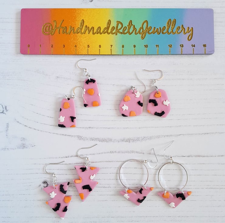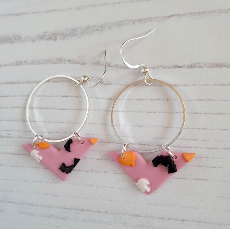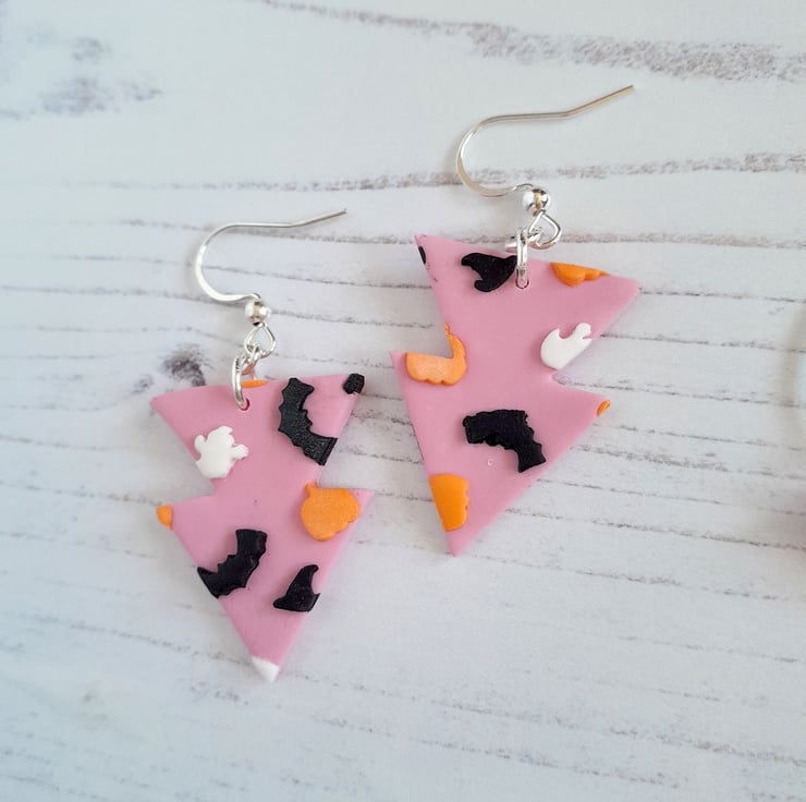 These beautiful and unique earrings have been carefully hand crafted using polymer clay, starting with a mixed pink flat layer of clay, then small ghosts, pumpkins, bats and witches hats cut out of clay, carefully placed all over the pink to create a 'slab'. This has then been cut into shape and edges have been sanded for a smooth finish.
