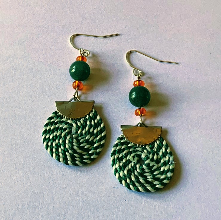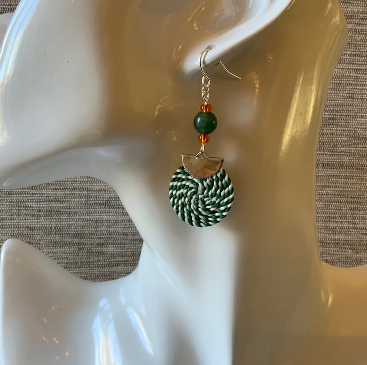 Satin cord spiral earrings in green and whilte with complementary beads in forrest green and a pop of bright orange.