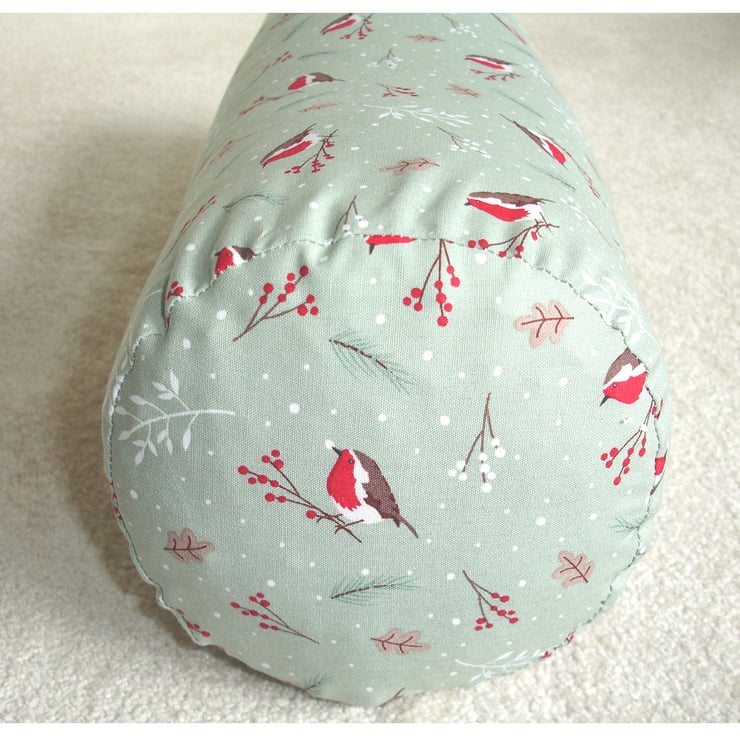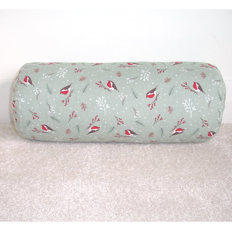 Christmas Robins in Red on a Sage Green Background. Christmas decorations on your sofa!