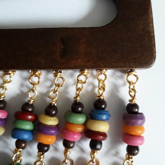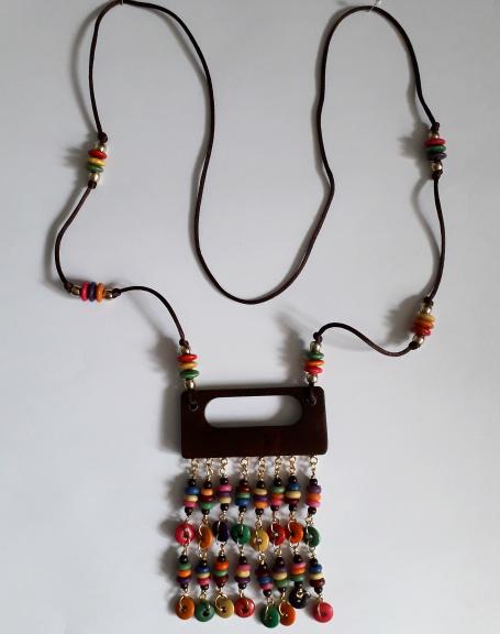 For this necklace I have used half of a dark brown wooden belt buckle which had convenient holes along the bottom allowing me to thread the wire through, I have made 8 dangles with multi coloured wooden and shell beads.