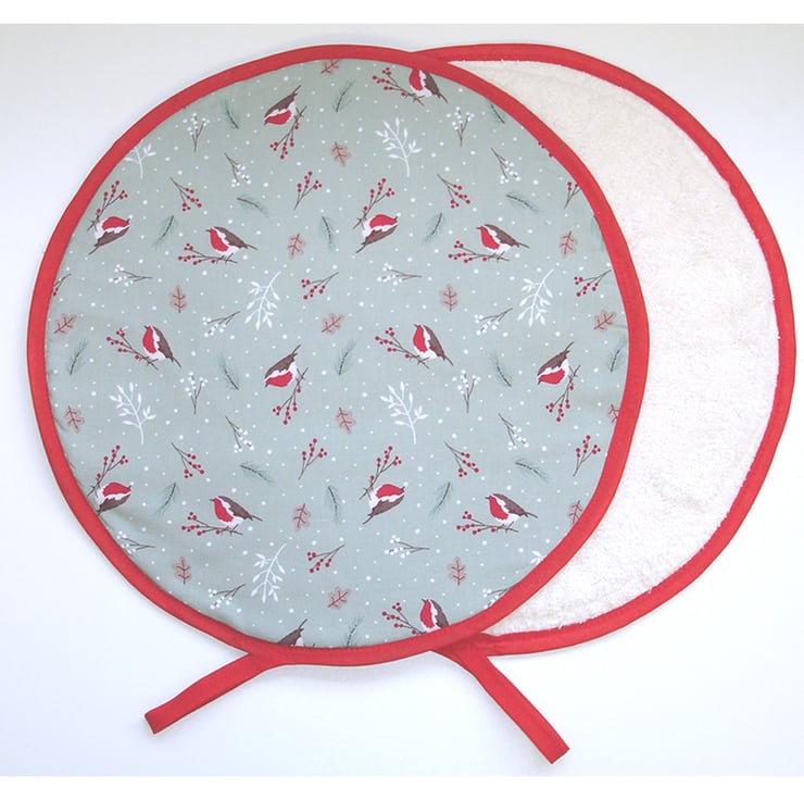 This mat has three layers - Facing cotton fabric, a layer of padding and a layer of towelling - Making it also suitable for mopping up and pot-grabbing!