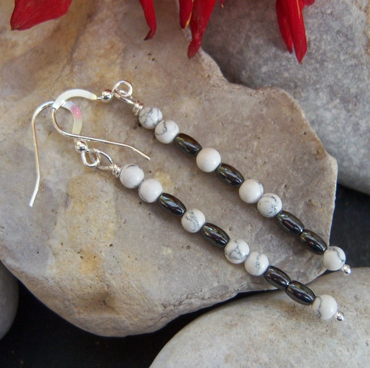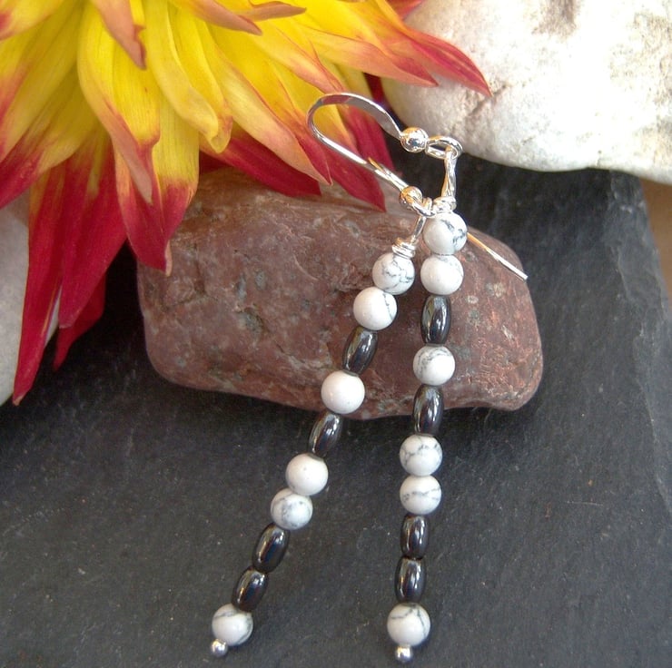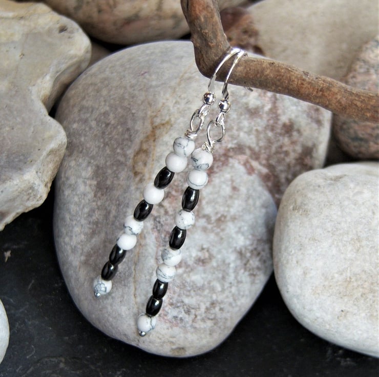 A secret message using morse code and gemstones on long dangly sterling silver wires. Howlite and haematitie. Sterling silver ear wires. Approximately 4.5cm drop.