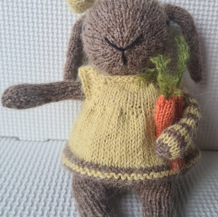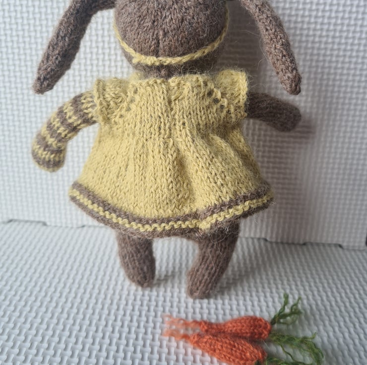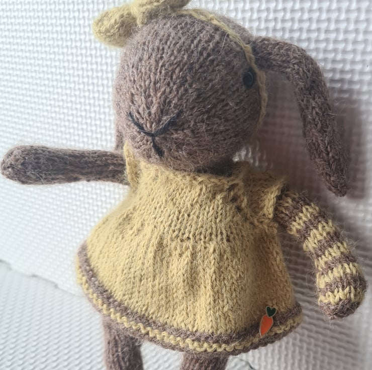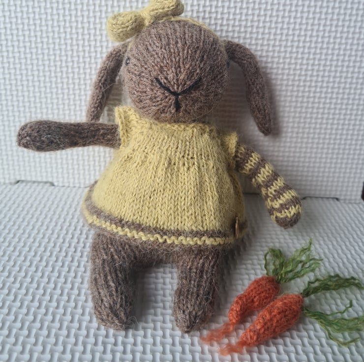 Hand knitted by me. Extremely cute bunny who has just bought her carrots to make her most favourite of cakes. Made from 100% Alpaca. Her dress and headband are removable and can be made in various different colours, as can the bunny. Not suitable for children under 3 due to small parts. This would be a custom knit and I make to order. I can give a realistic time frame when ordered, although I do try and have things made within 7-14 days. This was created from the pattern written by Lovely Knit Creation