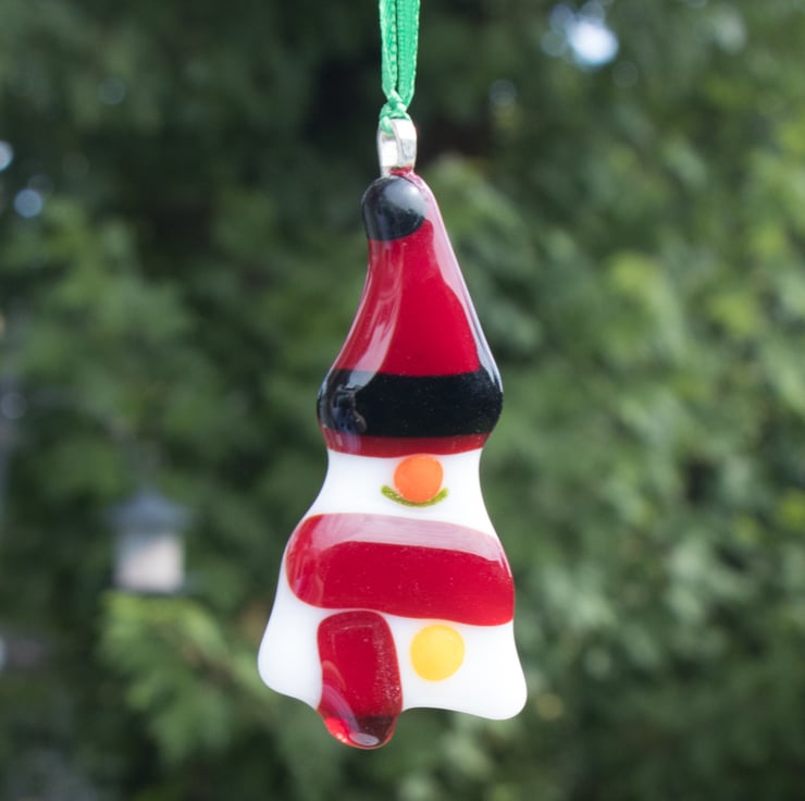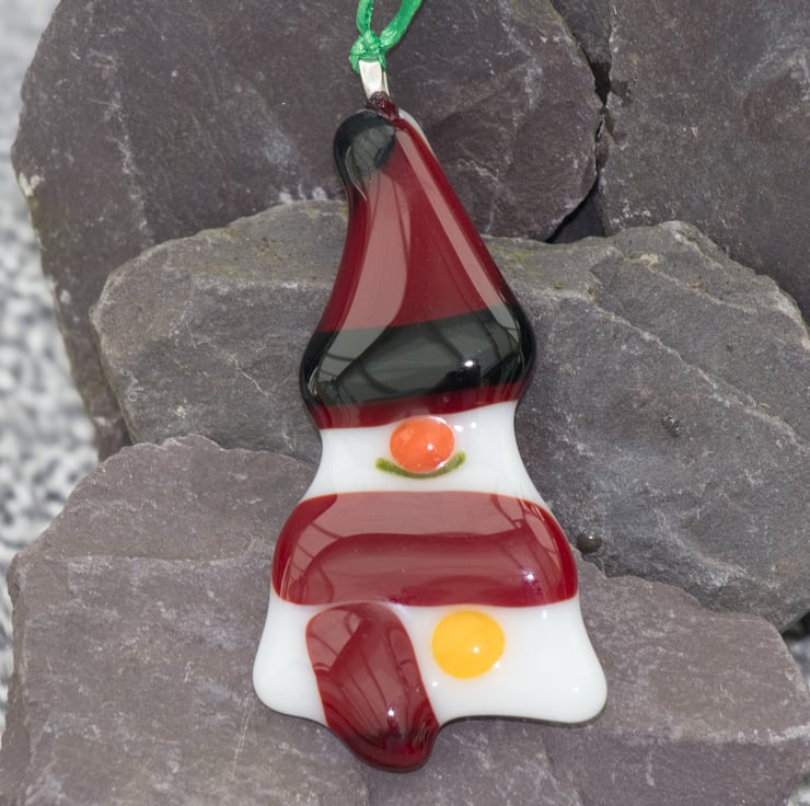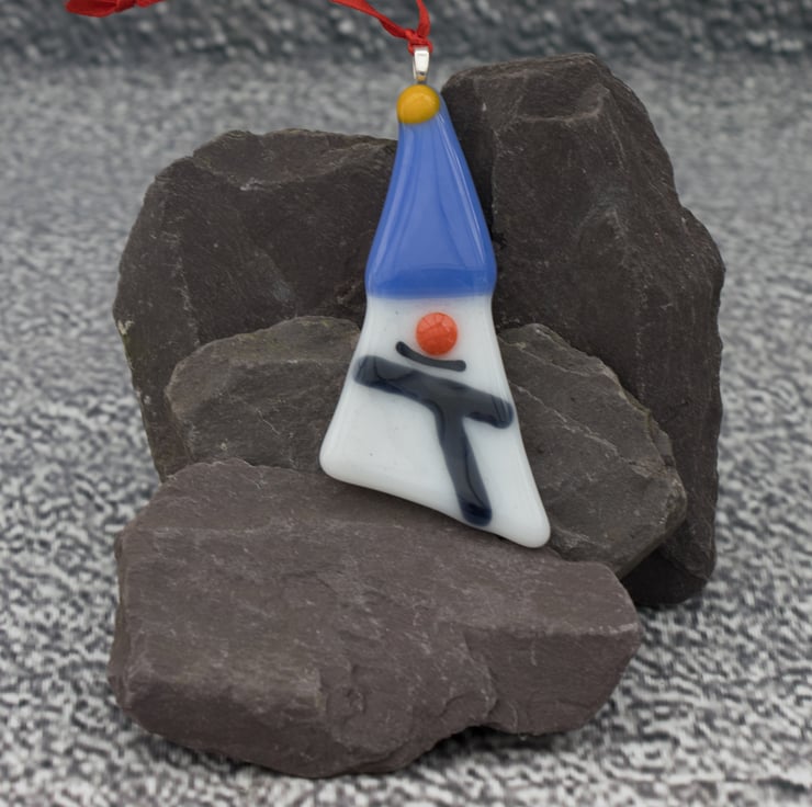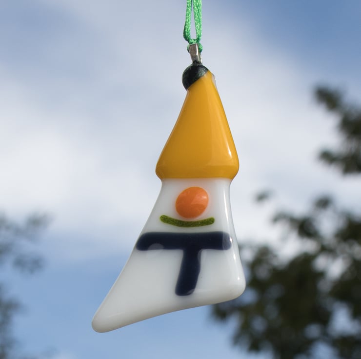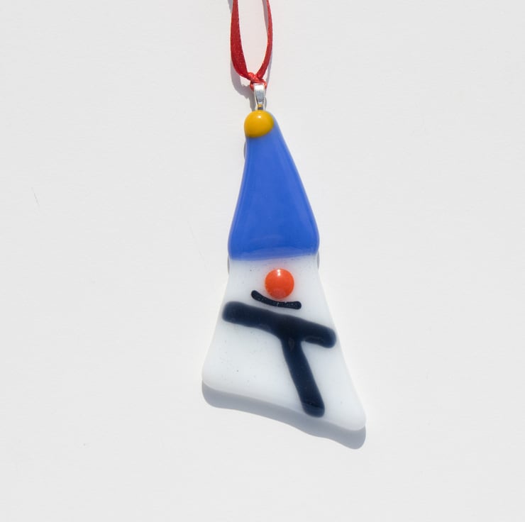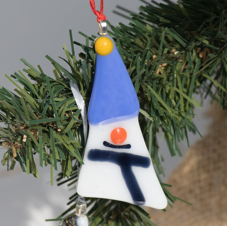 Each of the decorations has been carefully hand-cut and assembled before being treated to a session in the kiln to smooth the shapes and fuse all the elements together. Once cooled a metal bail is glued on and a length of colourful ribbon is threaded through.
