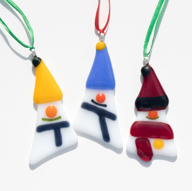 Each Snowman is between 7 and 8 cm high and is strung from a length of colourful ribbon. All wear a coloured hat and scarf and sport the traditional orange (carrot) nose. We promise that each one of these pieces is unique.