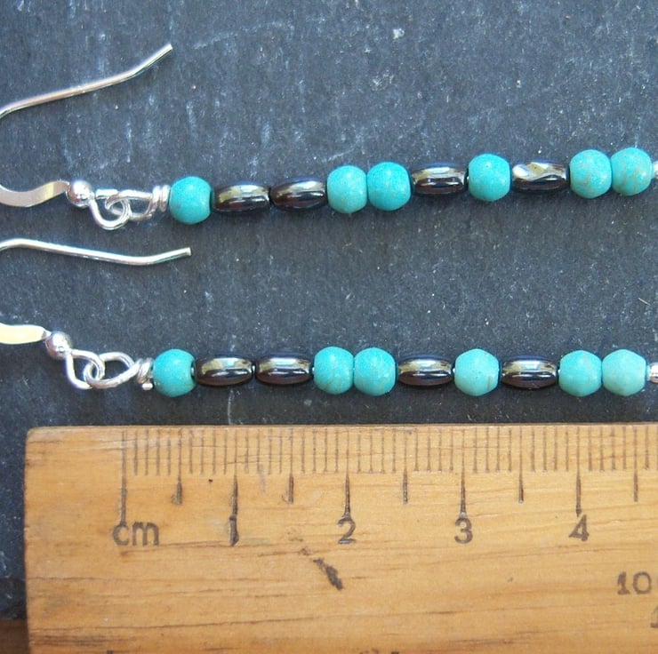 I CAN spelt out in morse code using haematitie and magnesite stones. Sterling silver wire and ear wires. Approximately 4.5cms drop.