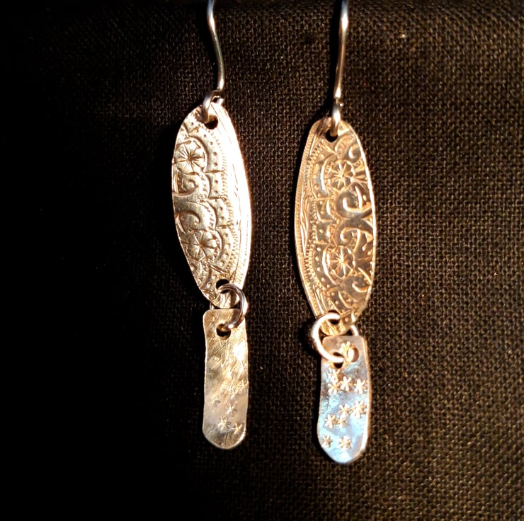 These earrings were nearly keepers! They feature upcycled texture silver rescued from an Old Victorian watch case and dangly 'beads' from a recent modern commission. They are very pretty - very individual and another pair will never be made.