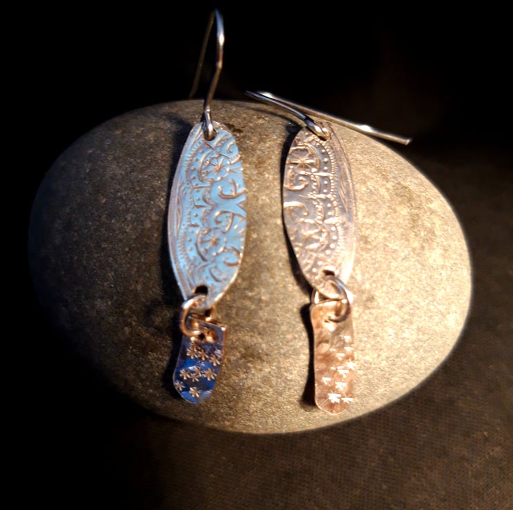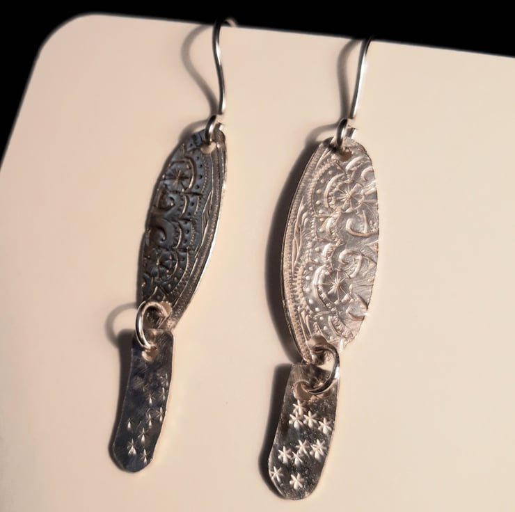 These earrings have been designed to use as much of the stunning textured silver as possible - therefore they are matching, but not exactly the same! They are approx 3.5cm in length and strung on silver loops.