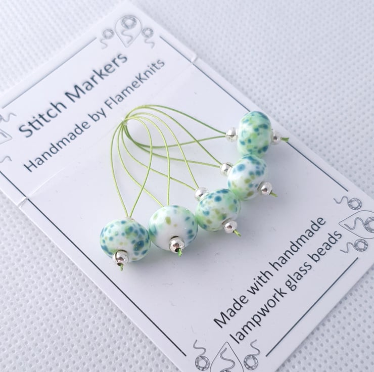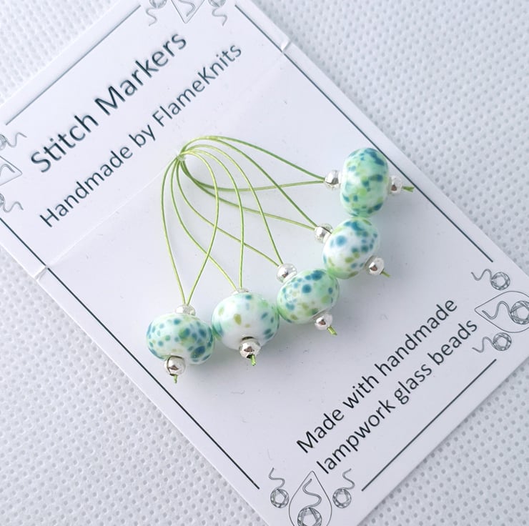 A set of 5 stitch markers made with lampwork glass beads in shades of pale greens and turquoise.
