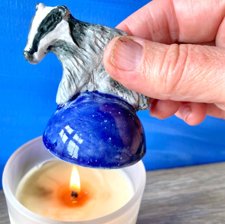 Hand crafted ceramic badger candle snuffer, created from my own original handmade moulds and hand finished and glazed to make each one unique . Reverse glazed but not detailed.