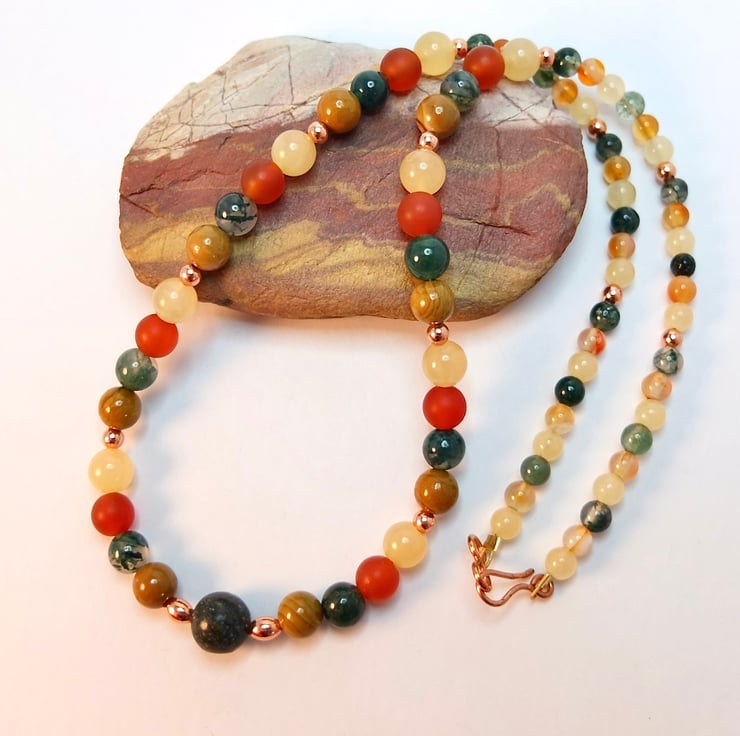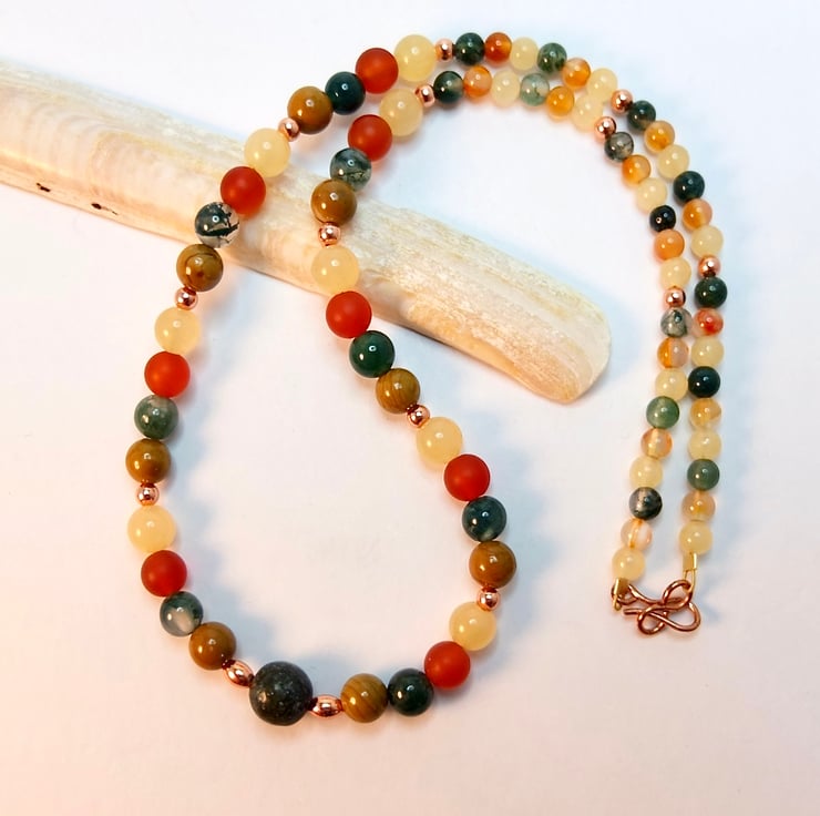 The necklace is made from 6mm beads of Moss Agate, Wood Lace Agate (aka petrified wood), Ambronite and frosted Carnelian, graduating to 4mm beads of Moss Agate, orange Carnelian and Ambronite.