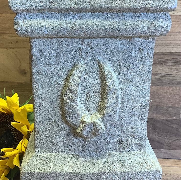 A stone carved replica of a Small Roman Altar. This has a wreath carved on the front and a bowl carved in the top for the offering with some swirls around the top.