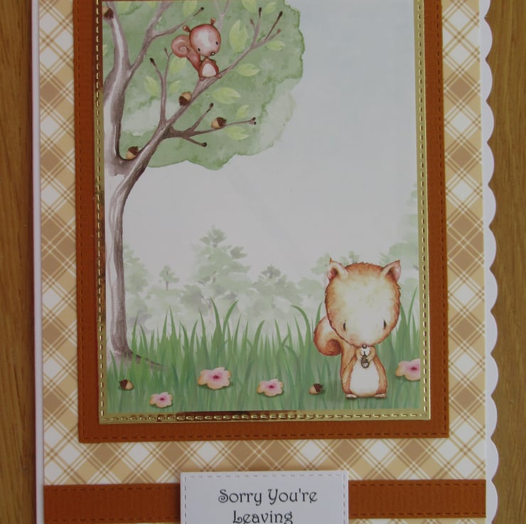 This lovely card features the image of 2 squirrels gathering their acorns for winter. I surrounded the image with 2 stitched edge mats which I die cut from gold mirror card and orange/brown card and these are all placed upon a decorative checked background. I then added a border and a Sorry You're Leaving greeting below the image and finished the inside to coordinate but left it blank for your own message.