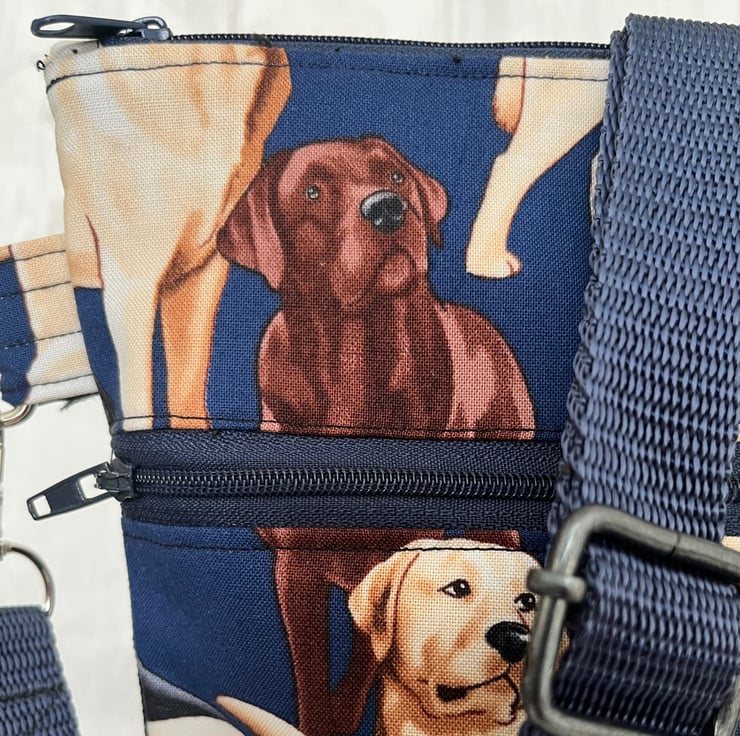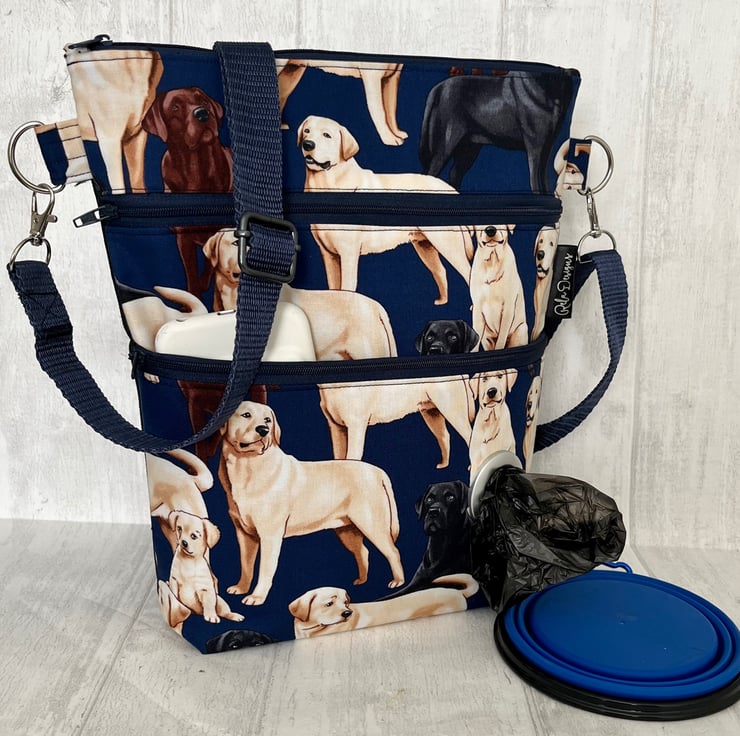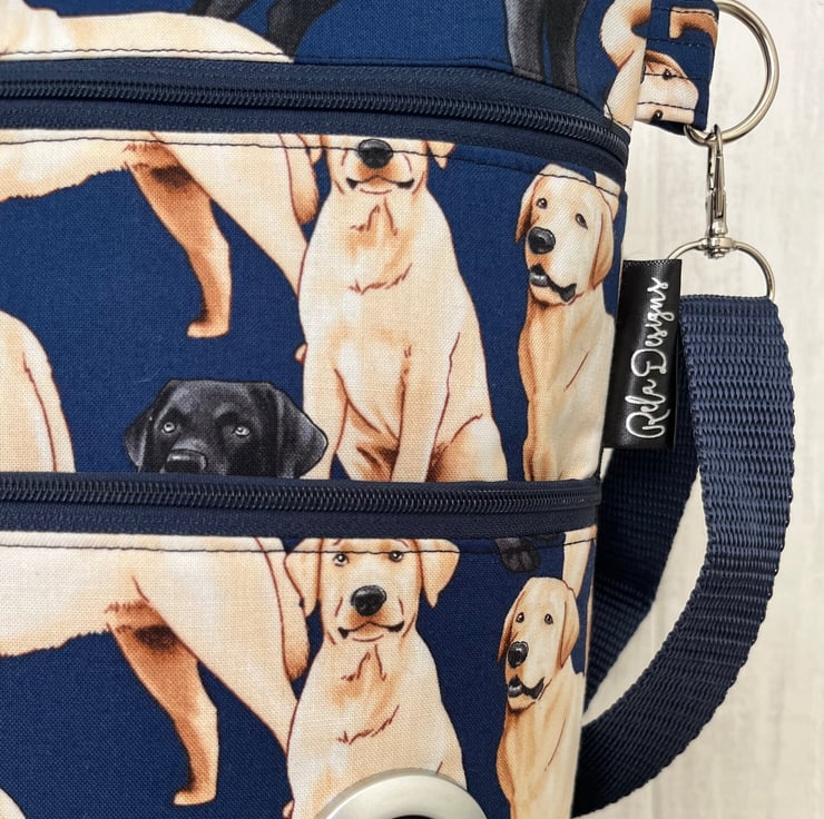 This Lovely Labrador cotton print dog walking bag is backed with a black waterproof canvas and is lined with a black waterproof nylon lining. This handy bag will hold all your essentials for walking your dog.