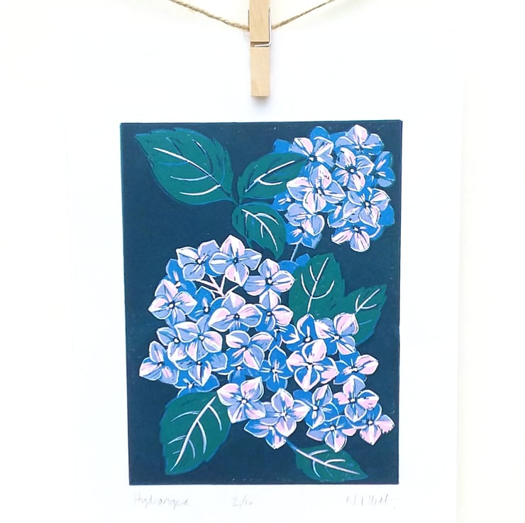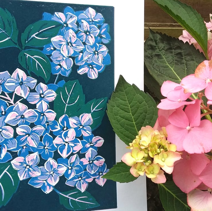 Each month I am printing a piece inspired by the flowers I have seen at that time of year - it has been a good way to take notice of the changing seasons. This August has been so hot and so very dry and I have found myself thinking of lush greens and abundant growth (all lacking in my garden). My sister returned from a wet holiday in North Wales with beautiful photos of moist woodlands, moss and hydrangeas. I thought them a perfect choice for August with their beautiful pink and blue flower heads holding memories of holidays and wetter years.