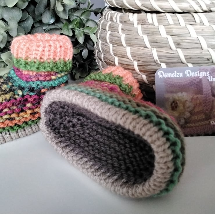 A sweet practical pair of cosy warm booties ideal for everyday wear when out and about in the stroller or car seat. They have been lovingly designed and hand crafted using quality branded British premium machine washable yarns.
