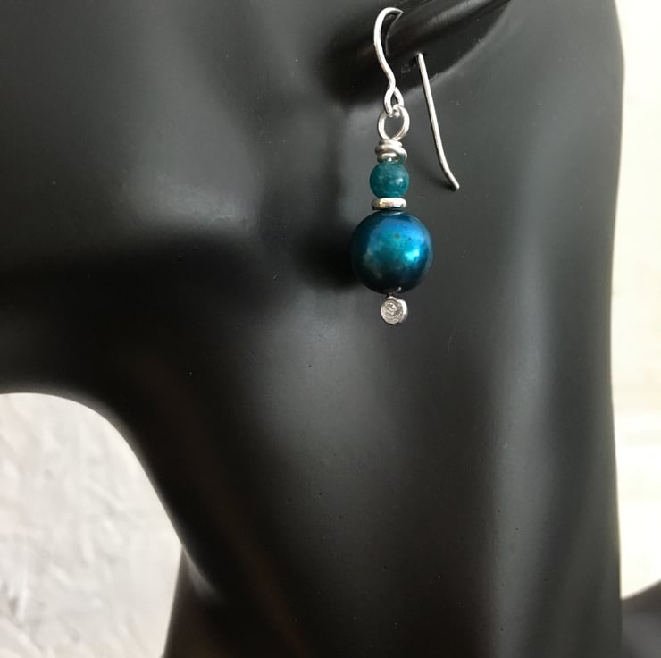 Large almost round pearls have been teamed with small round teal apatite beads.