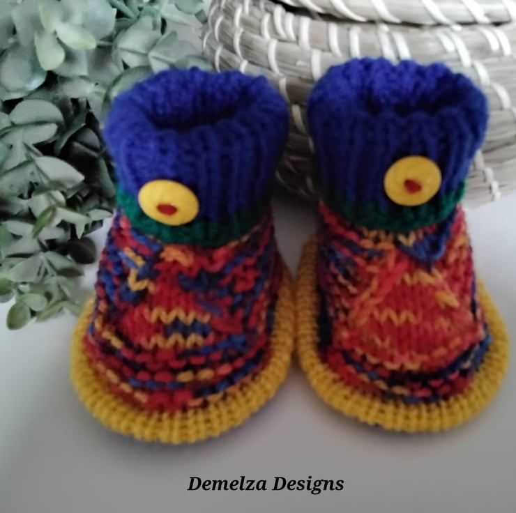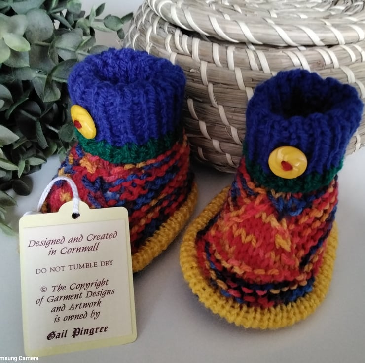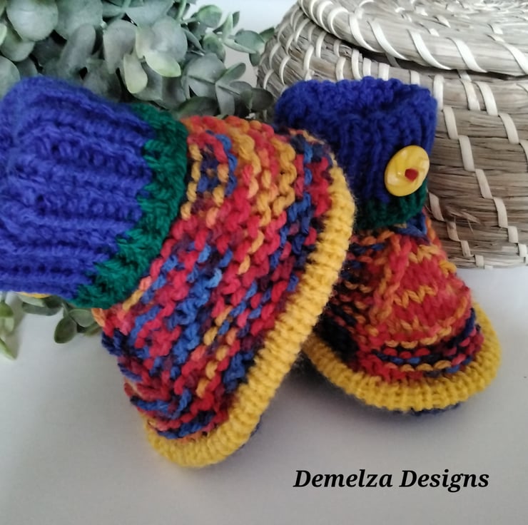 A swet practical pair of cosy warm booties ideal for everyday wear when out and about in the stroller or car seat. They have been lovingly designed and hand crafted using quality branded British premium machine washable yarns.