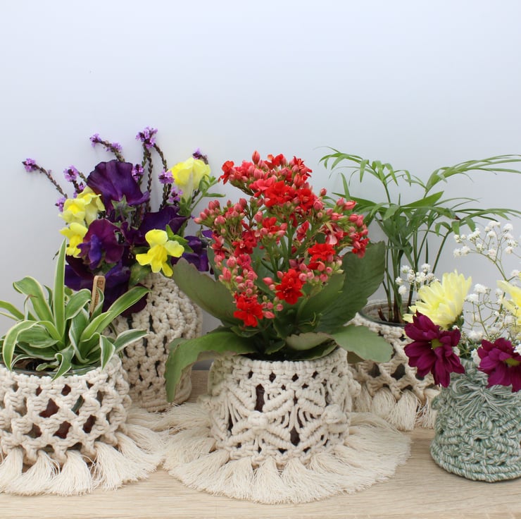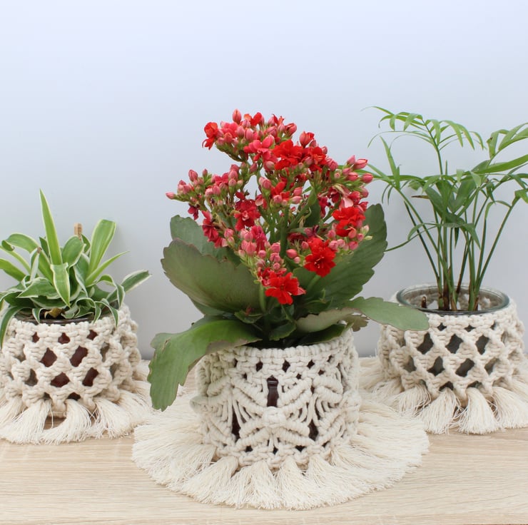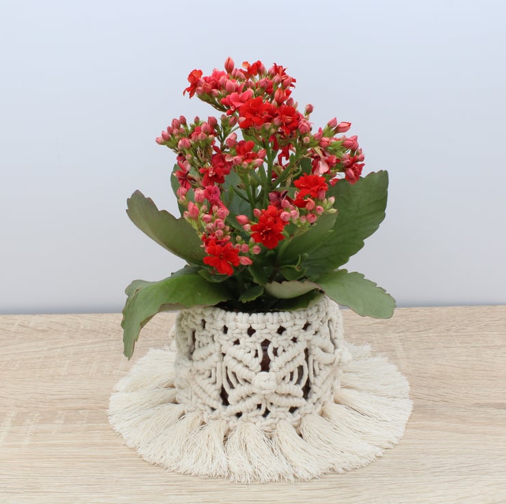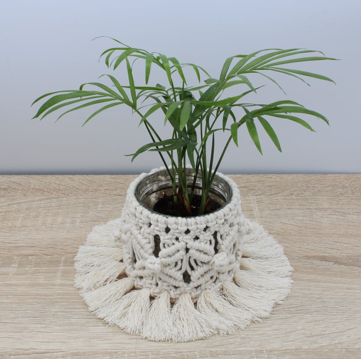 Upcycled, repurposed jar covered in an intricate macramé flower design made from recycled cotton. To finish off the design, the cords have been brushed out into a pretty skirt round the base.