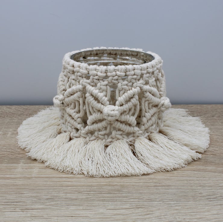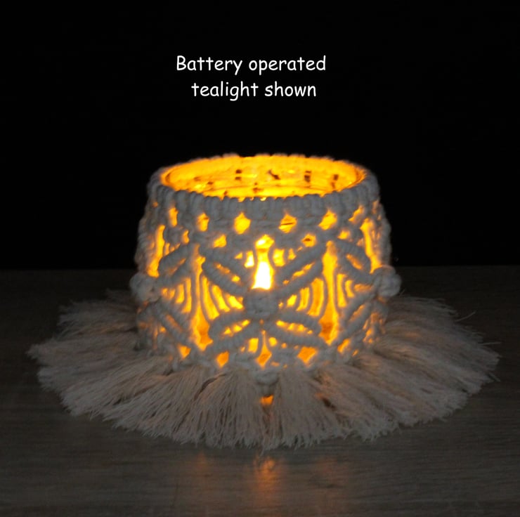 This jar makes a great mini plant pot holder to brighten up the smallest of spaces. it can also be used to store bits and bobs or used as a battery operated tealight holder. PLEASE NOTE only battery operated tealights are recommended. The jars original purpose was not for use with a naked flame and also the macrame cords come right to the top of the jar hiding the rim. The battery tealights are also very effective.