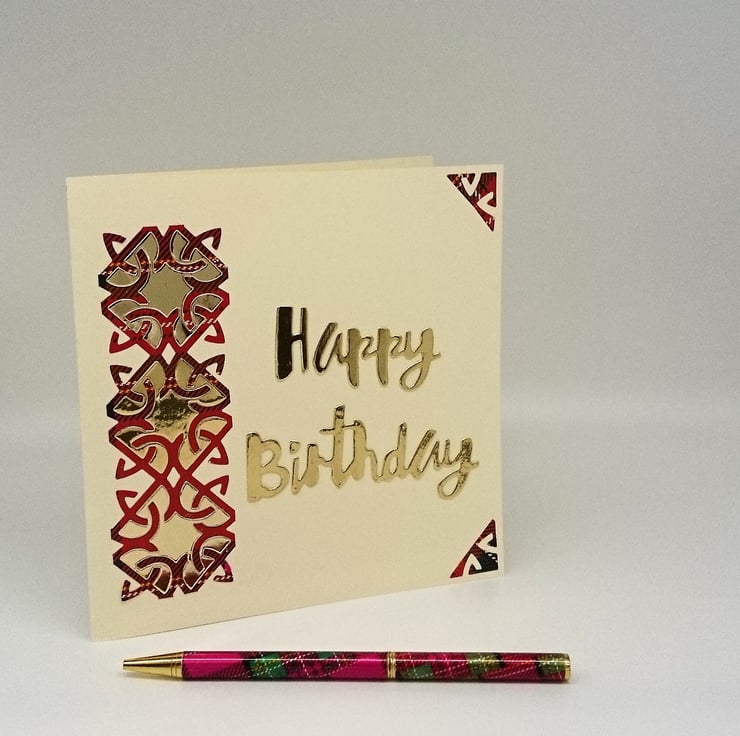 Classy birthday card in red tartan and shiny gold Celtic design. Great card for all lovers of tartan or all things Celtic. Handmade with love in my wee studio in Argyll Scotland. FREE POSTAGE TO UK.