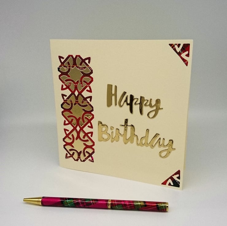 DESCRIPTION: Cream card layered with panel of Celtic braid design in vibrant red tartan inlaid with gold mirror Celtic pieces, finished with red tartan Celtic corners and a large bold "Happy Birthday" gold mirror sentiment.