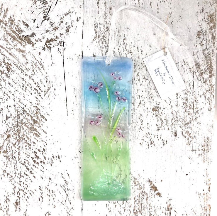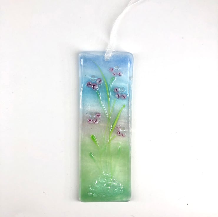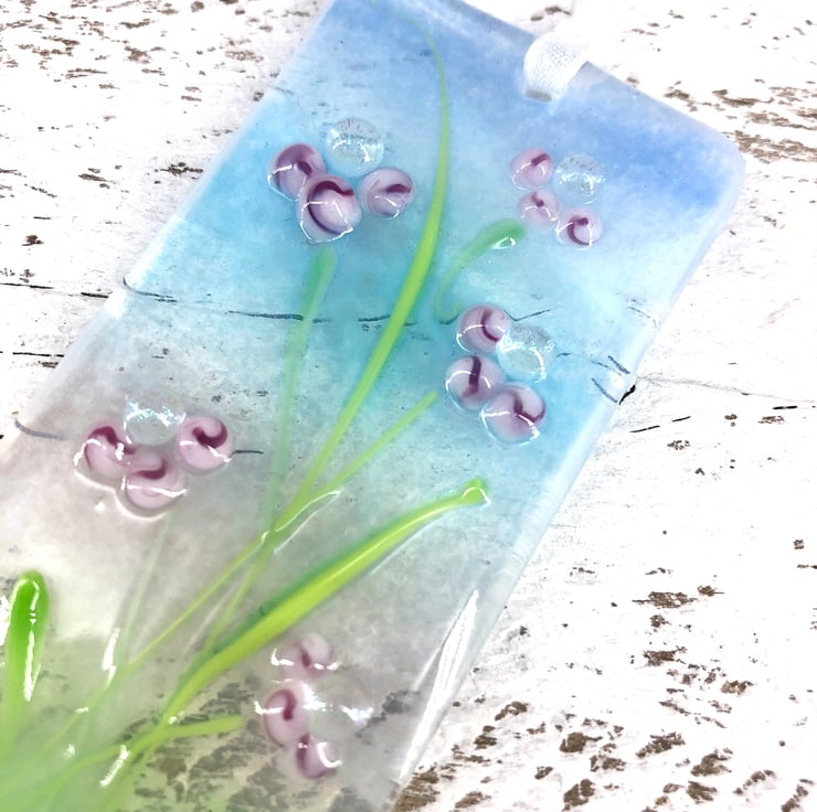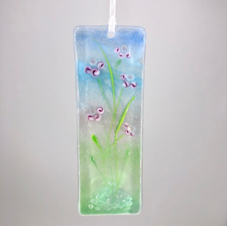 A lovely fused glass light catcher with dainty pink flowers. Hung on a piece of organza ribbon it allows the light to travel through - this gives the piece depth and shows off the full beauty of the glass.