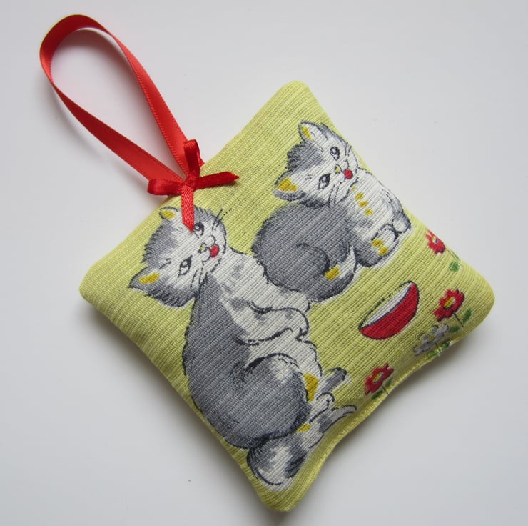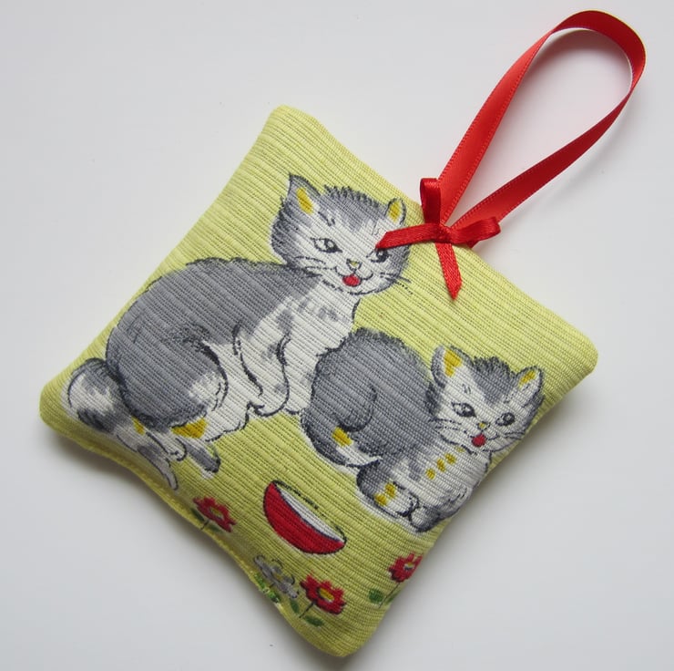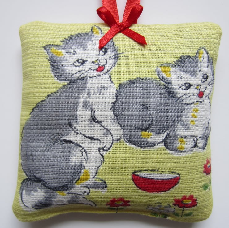 Hanging lavender sachet made from an unused vintage 1950s fabric featuring 2 cats.