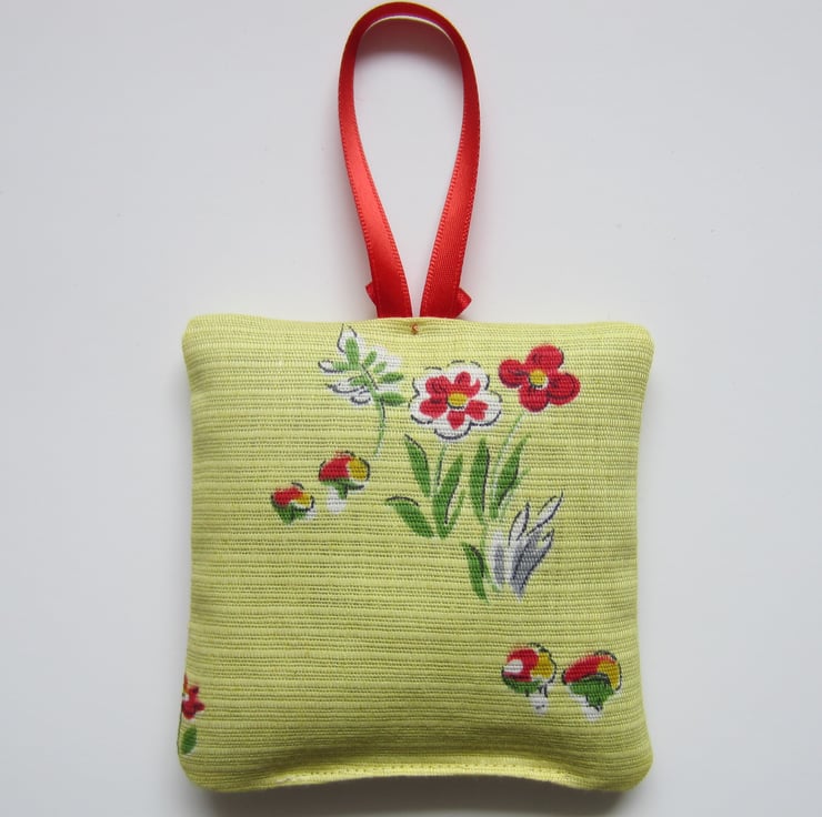 It is filled with Suffolk lavender hand picked and prepared by me and hangs with a red ribbon loop.