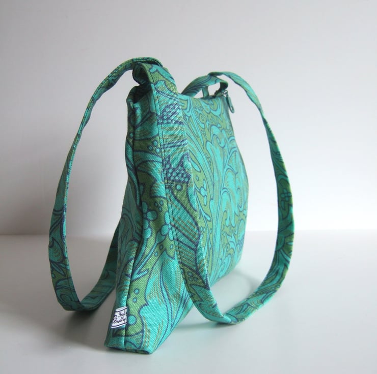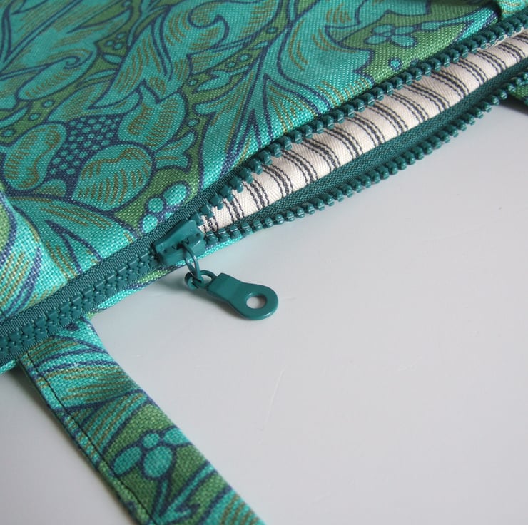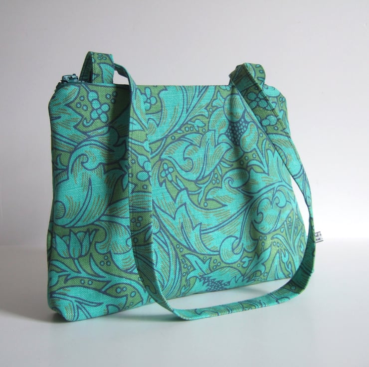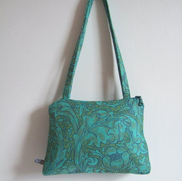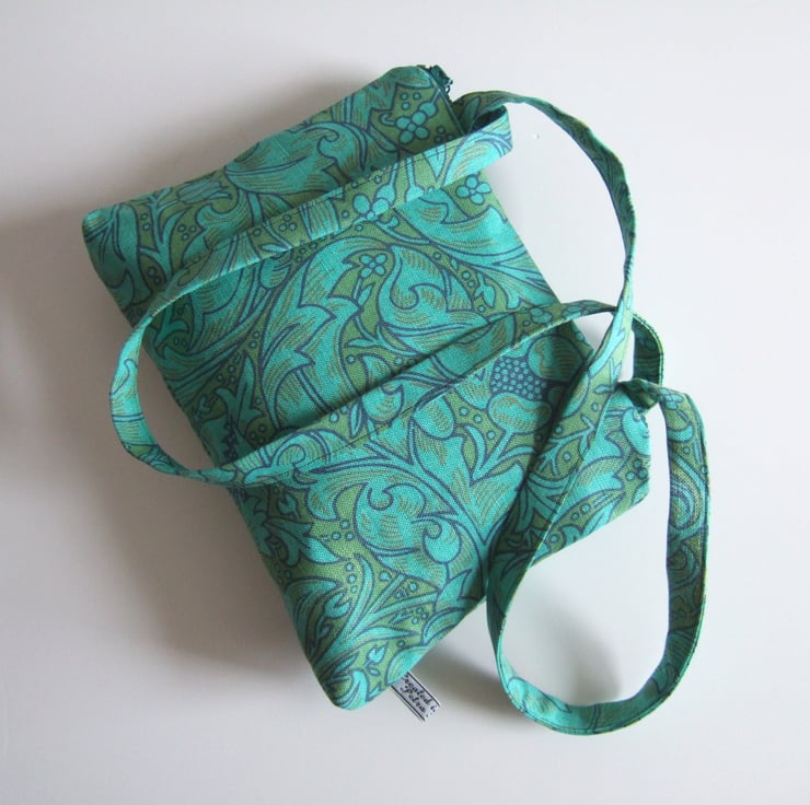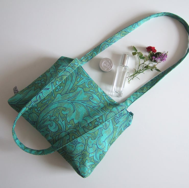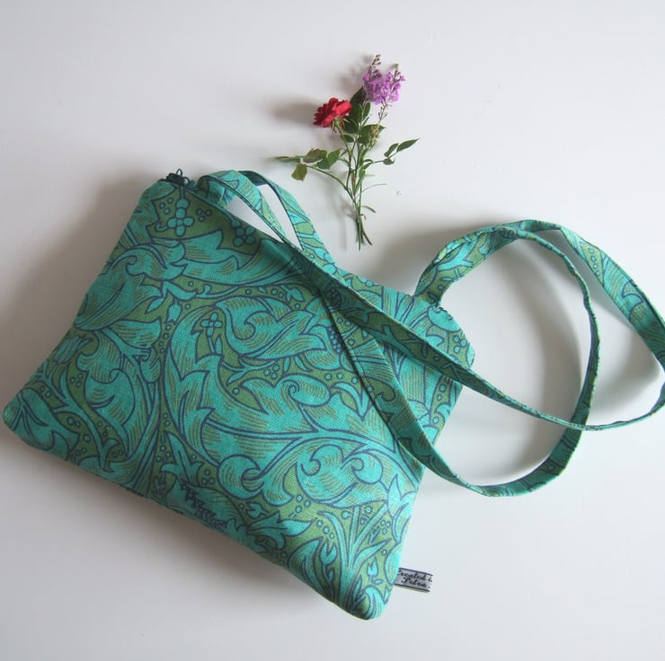 This neat and practical little handbag or shoulder bag is sewn from a fabulous updated William Morris print in beautiful shades of green. It has two long straps, an internal pocket to keep the flotsam and jetsam of your life organised, and fits neatly under your arm. It is large enough to carry all your essentials with style, and closes with a satisfying chunky zip. It would make a great bag to take to an autumn wedding, or as a present for a William Morris and Co fan.