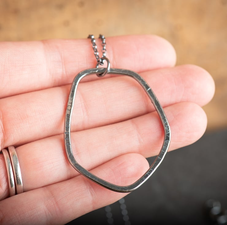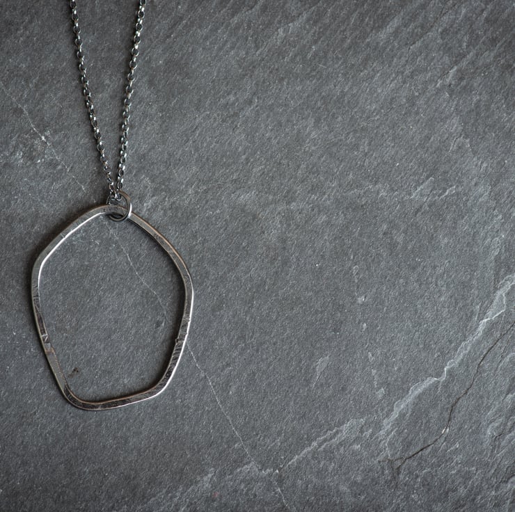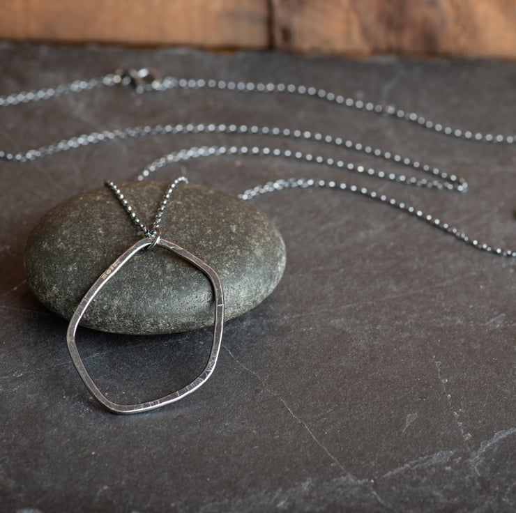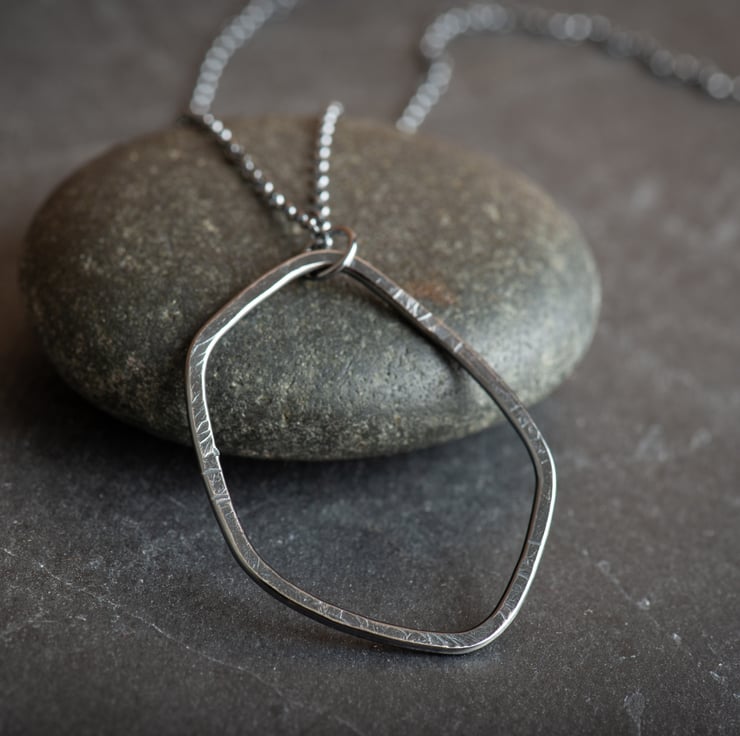 I have hand formed, soldered and textured the abstract pebble shape, which hangs from a 30 inch sterling silver chain. This length makes it quite a statement, and it looks great with a sweater or jumper dress!
