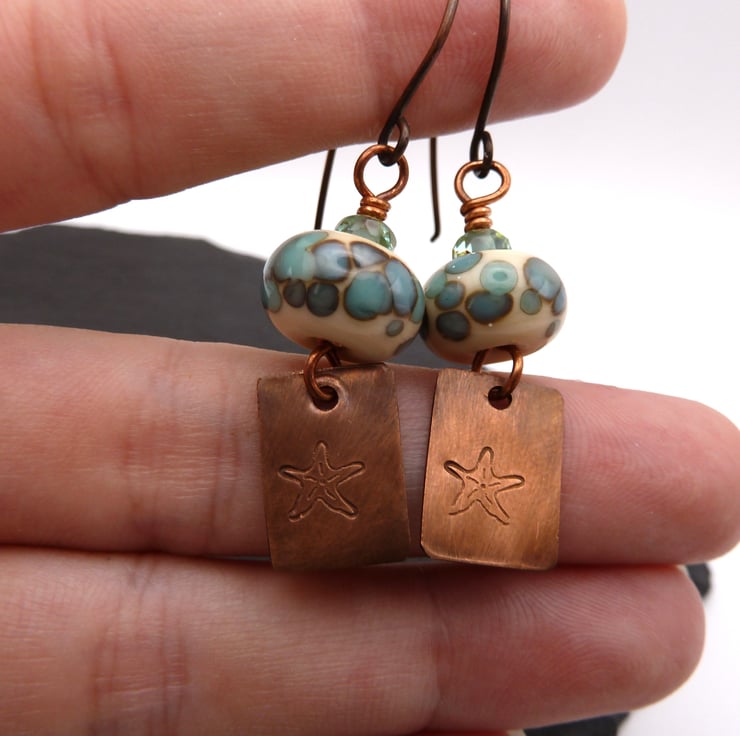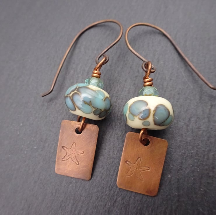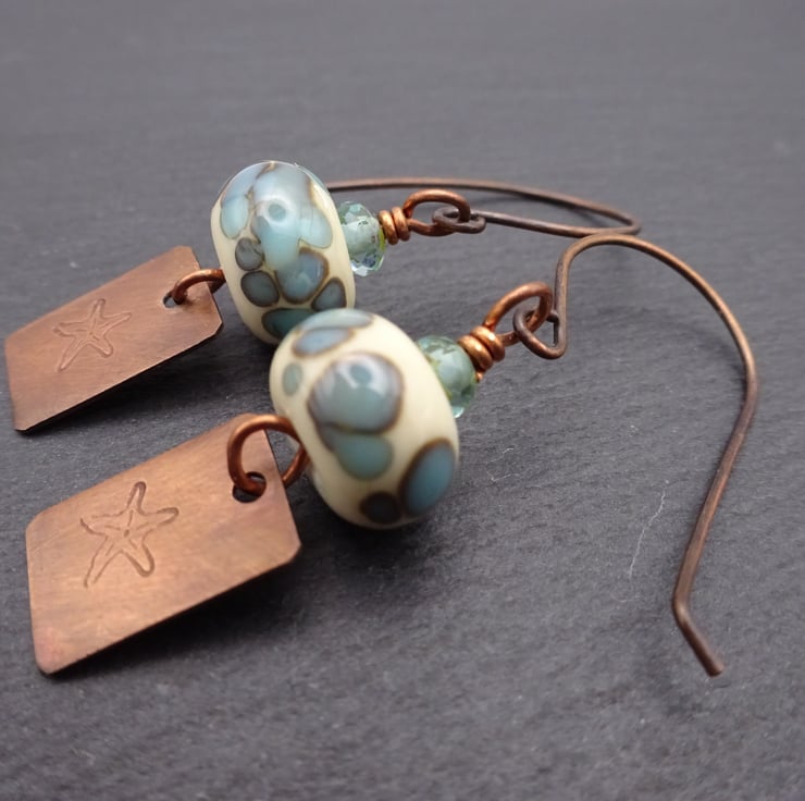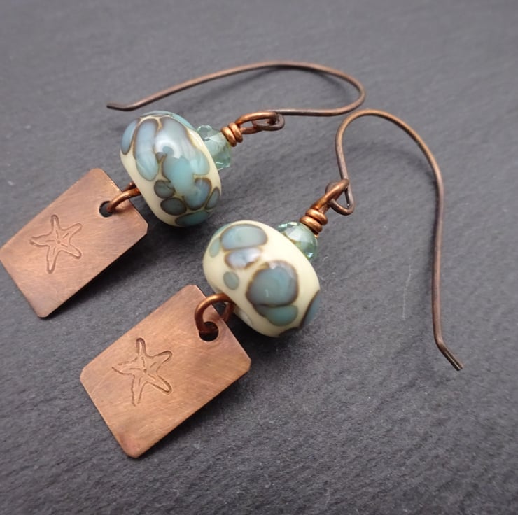 A pair of earrings made with handmade copper ear wires, handmade lampwork glass beads, Czech glass beads and handmade copper charms which have been stamped with a star fish.