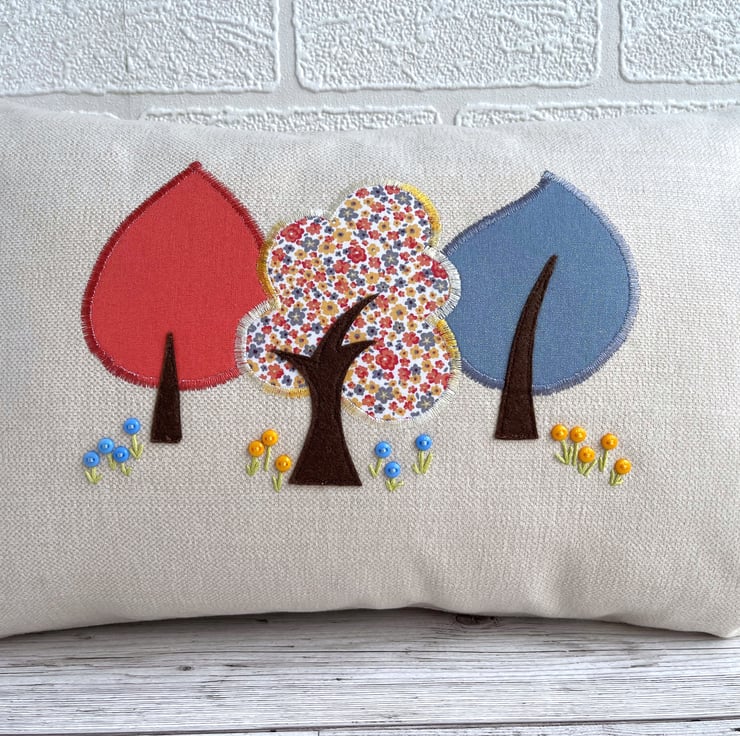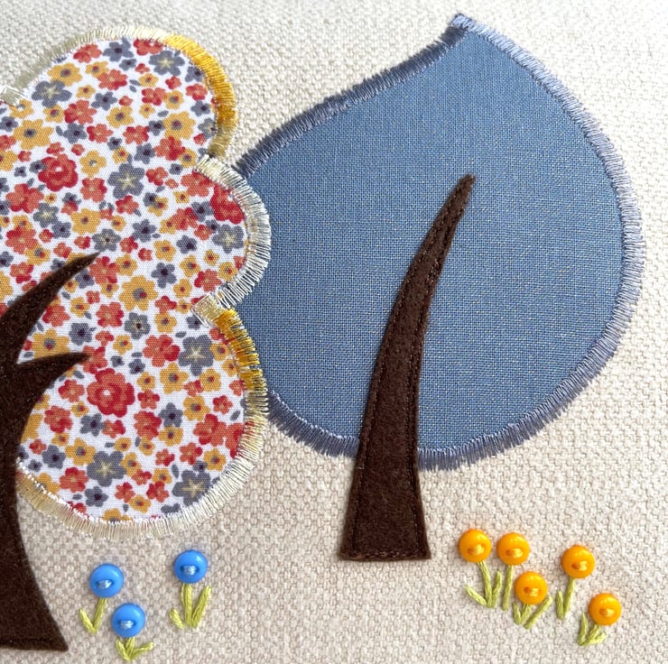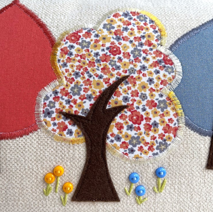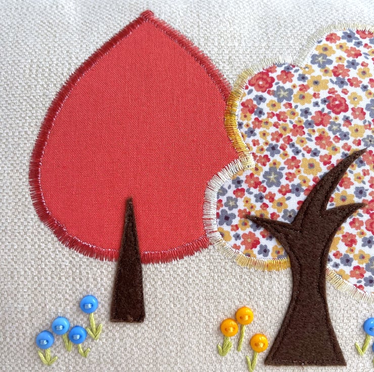 Trees and flowers cushion. A lovely rectangular cushion in warm cream fabric with an appliqué scene featuring three trees surrounded by button flowers. The trees are made from co-ordinating fabrics. There are two plain trees, one in orange-red and one in blue, both with gorgeous tiny gold sparkles. The middle tree is white with a ditsy floral pattern in shades of orange-red, blue-grey and golden yellow. The tree trunks are all made from brown felt. I’ve added clusters of tiny buttons in blue and golden yellow to resemble flowers, and I’ve hand-embroidered the stems and leaves in zesty green thread. The cushion cover has a concealed zip along the bottom and comes with a polyester hollow fibre cushion pad, which conforms to safety regulations.