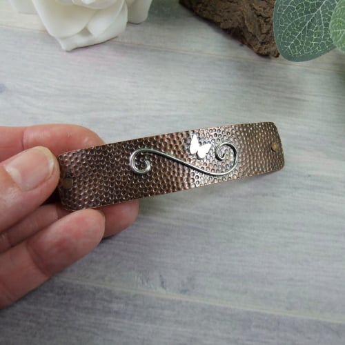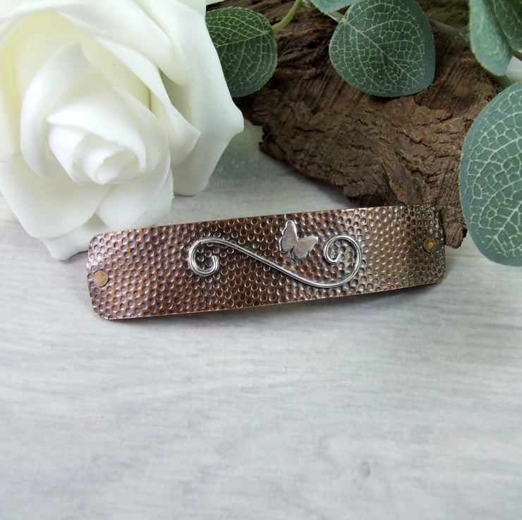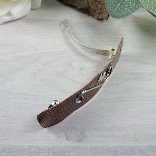 I created the barrette base using copper sheet, which I have cut by hand then embossed with a dotty texture. To the front I have added a scroll and a teenie butterfly in contrasting white metal all soldered securely in place. I have fitted this to a purpose bought 2.5 steel spring clip.