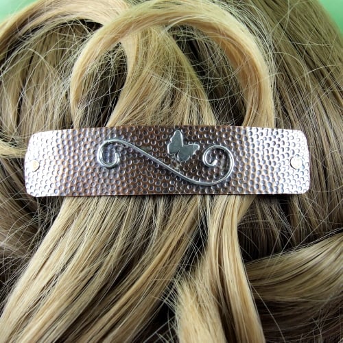 Handcrafted Hair Barrette in copper with contrasting white metal butterfly and wire scroll. 2.5 inch steel spring clip.
