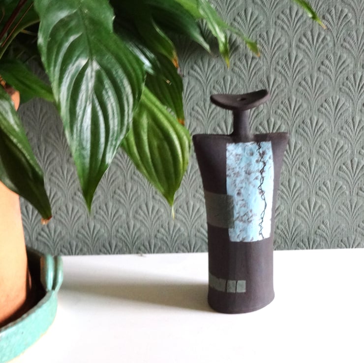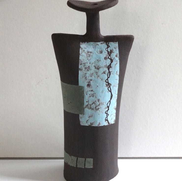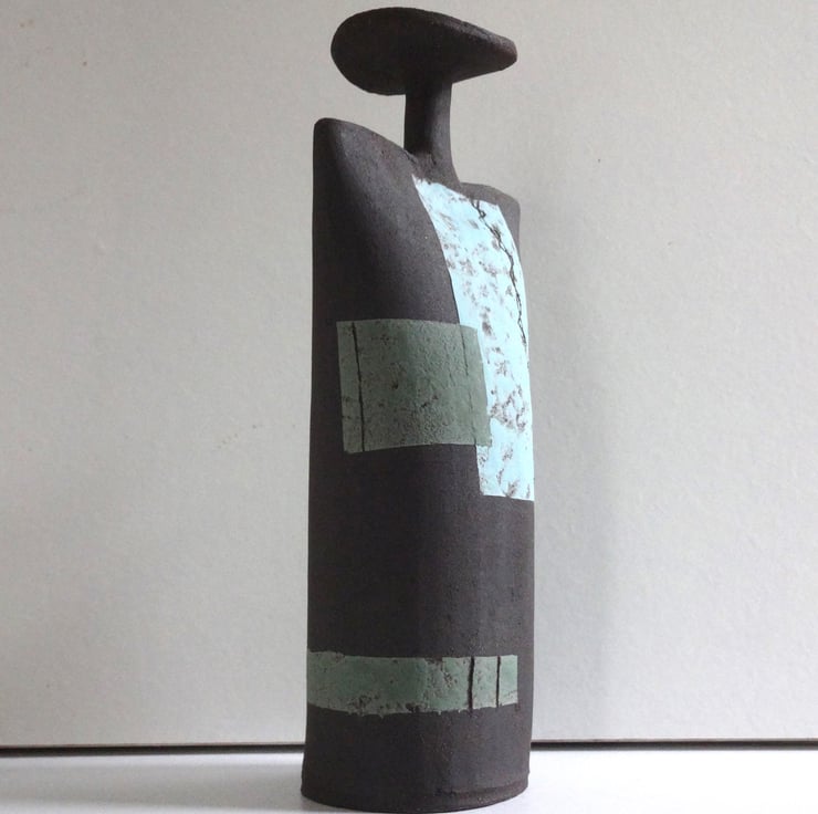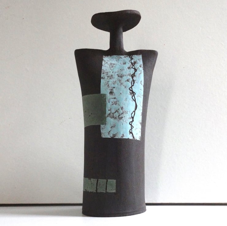 A contemporary abstract sculptural ceramic standing form, this piece is from my Kindred Collection. I handmade this quiet contemplative piece to add an individual touch of art to your living space but which can also be used as a focus of attention during yoga and mindfulness meditation. My inspiration comes from archaeological finds – the small figures and votive objects found in burial sites since time immemorial. In contrast, I decorate with abstract motifs influenced by modern abstract art and textiles. Each piece in the Kindred Collection is different because each is entirely handmade – I don’t use moulds or transfers. Each has a personality of its own. This one is 19cm high, fashioned from black stoneware clay and decorated with coloured liquid slips fired into the surface and enhanced with sgraffito markings etched into the slip in an undulating line.