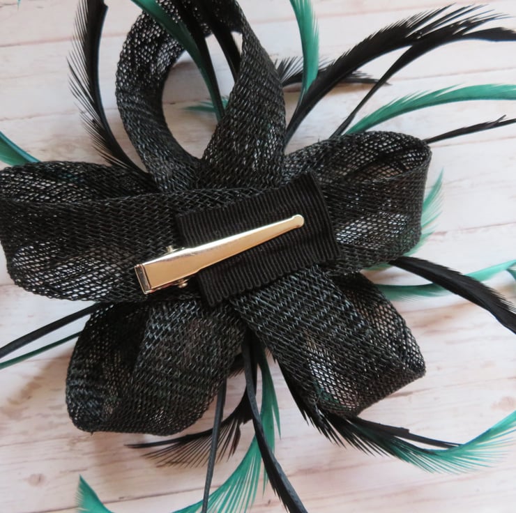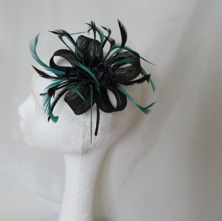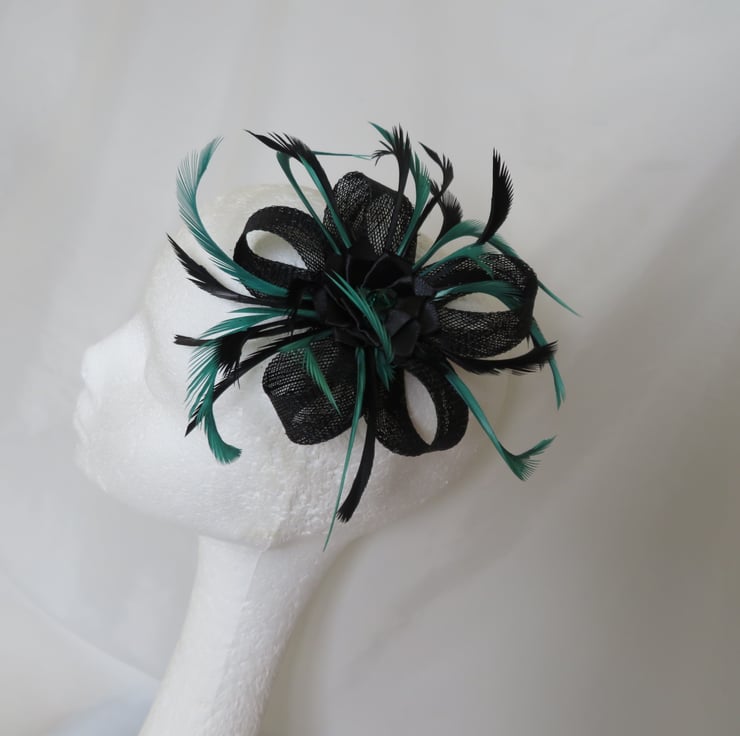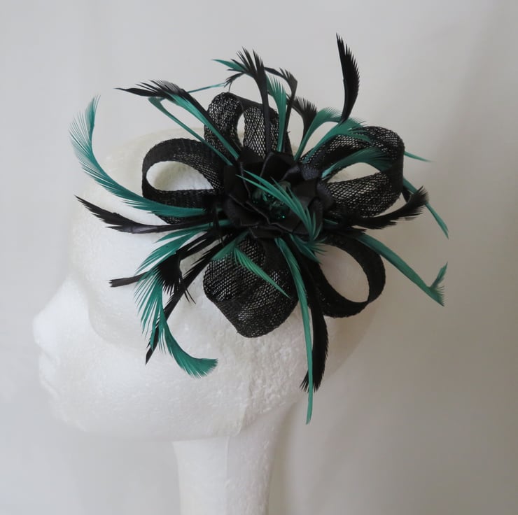 This is an attractive and eye catching sinamay loop fascinator in black and bottle green.
